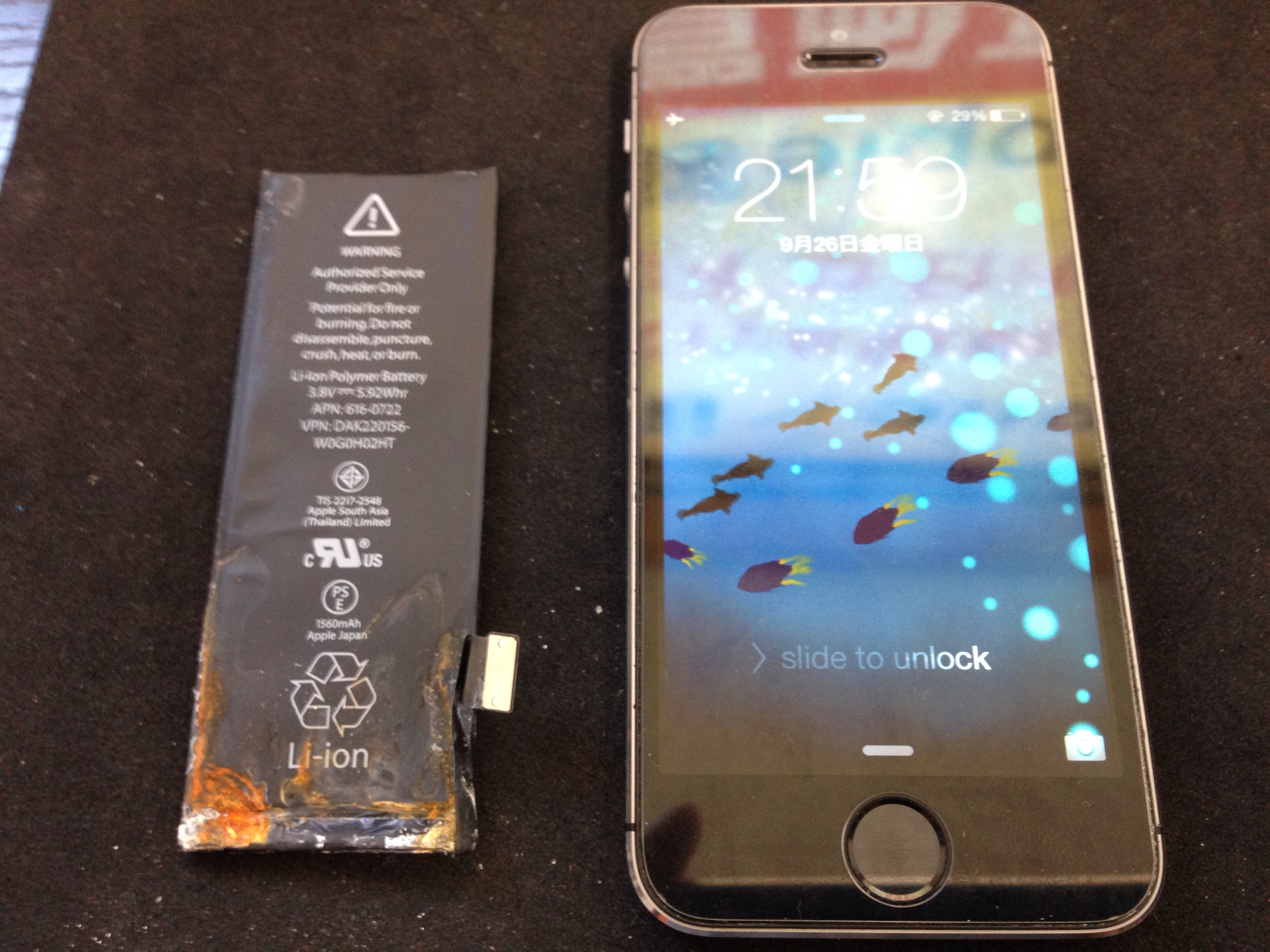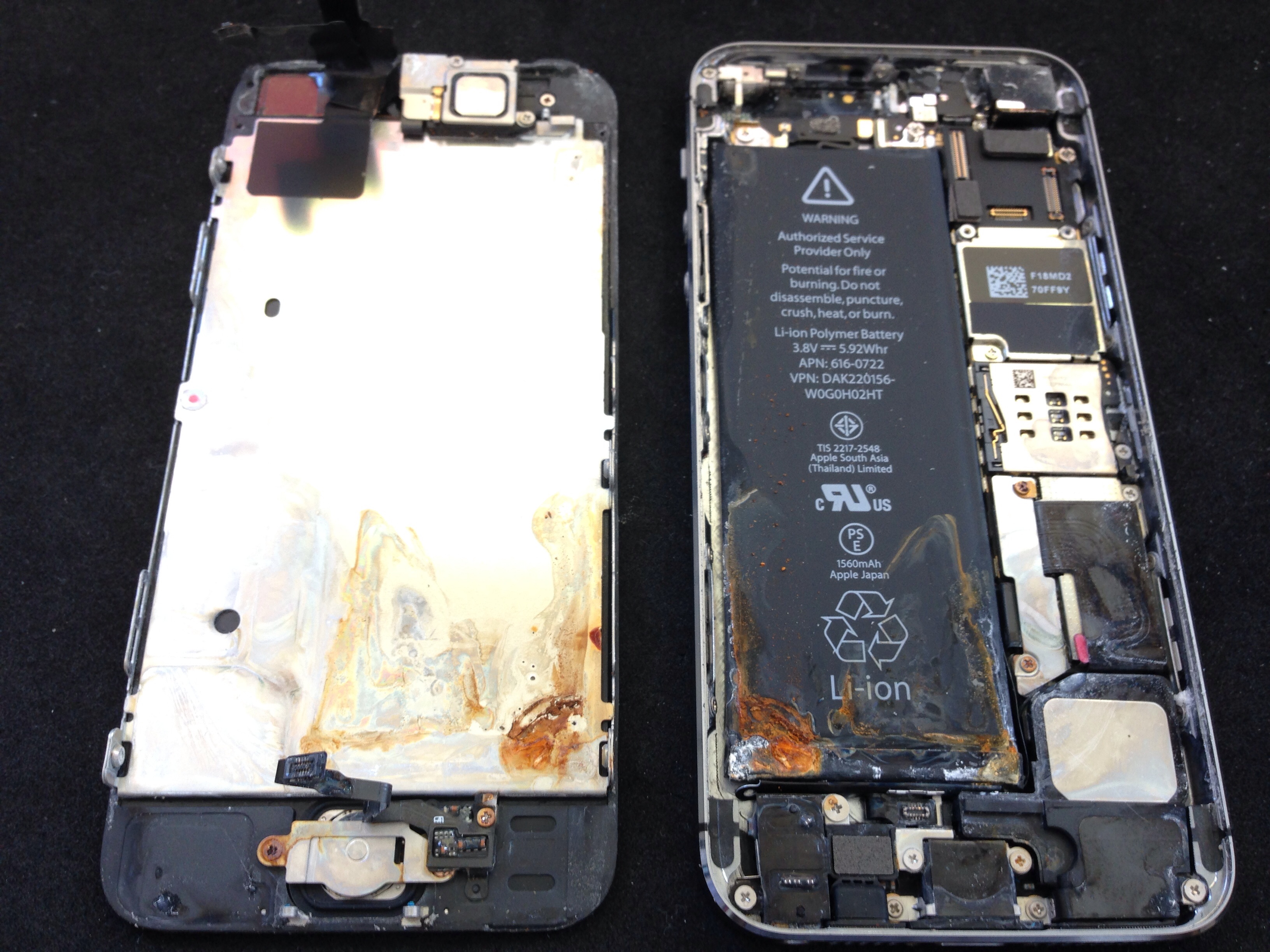 例えば今回のように基盤洗浄+バッテリー交換で復旧した場合は交換したiPhone5sバッテリー代金のみ¥6,800で水没修理が可能です。