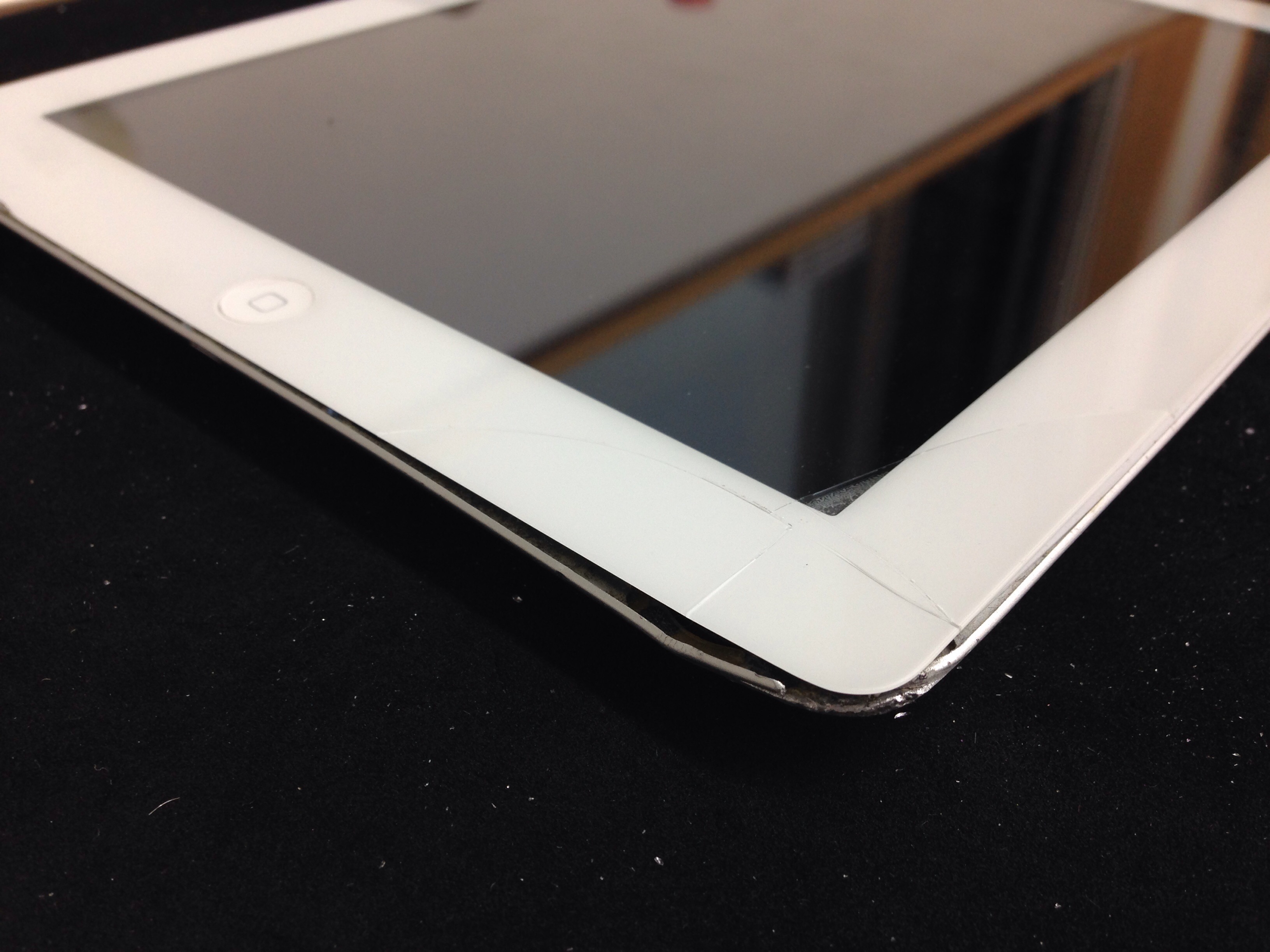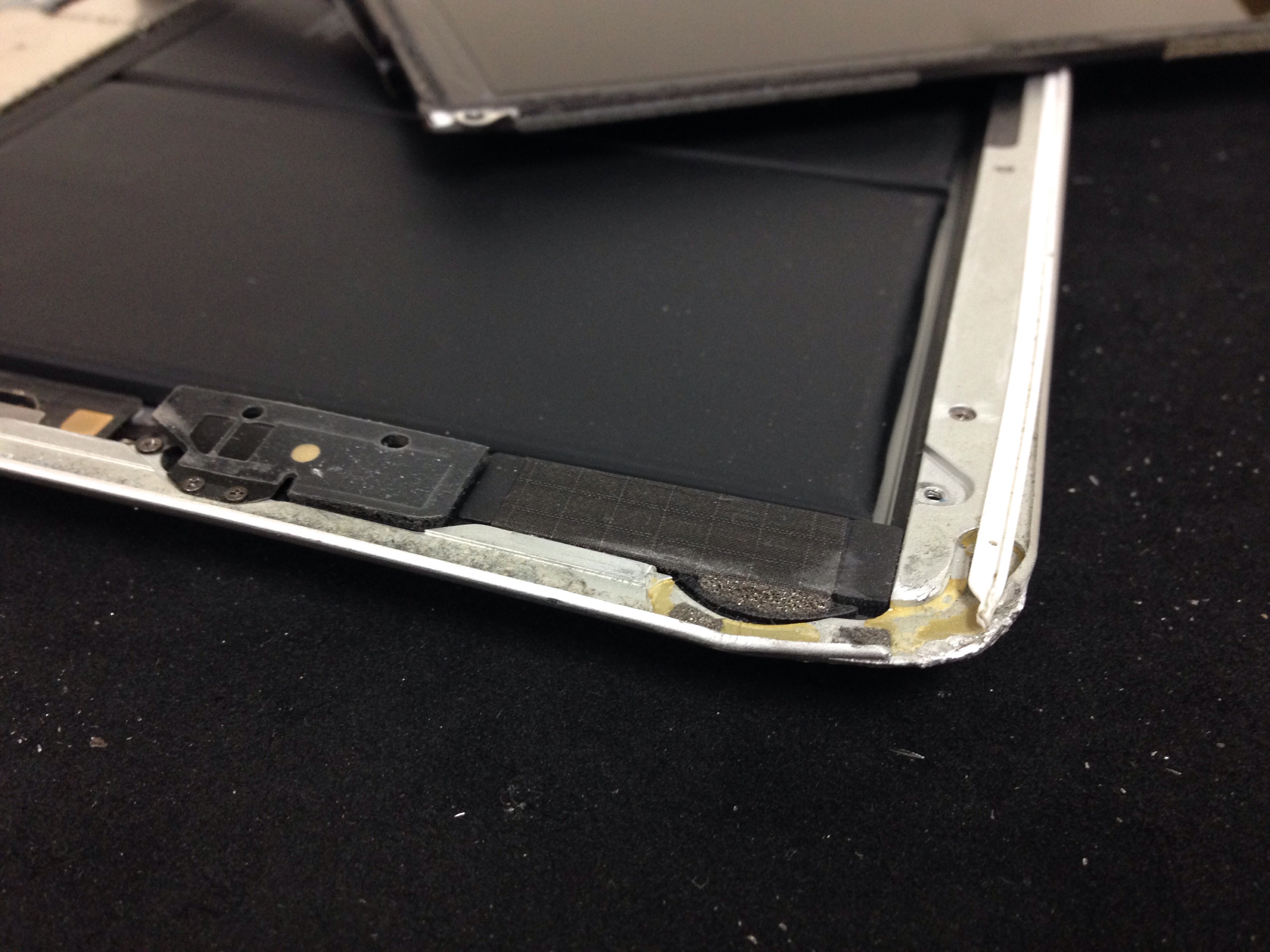 こちらのiPadは本体フレームがかなり激しく歪んでおりこのままの状態では新しいガラスをはめ込むことが出来ません。