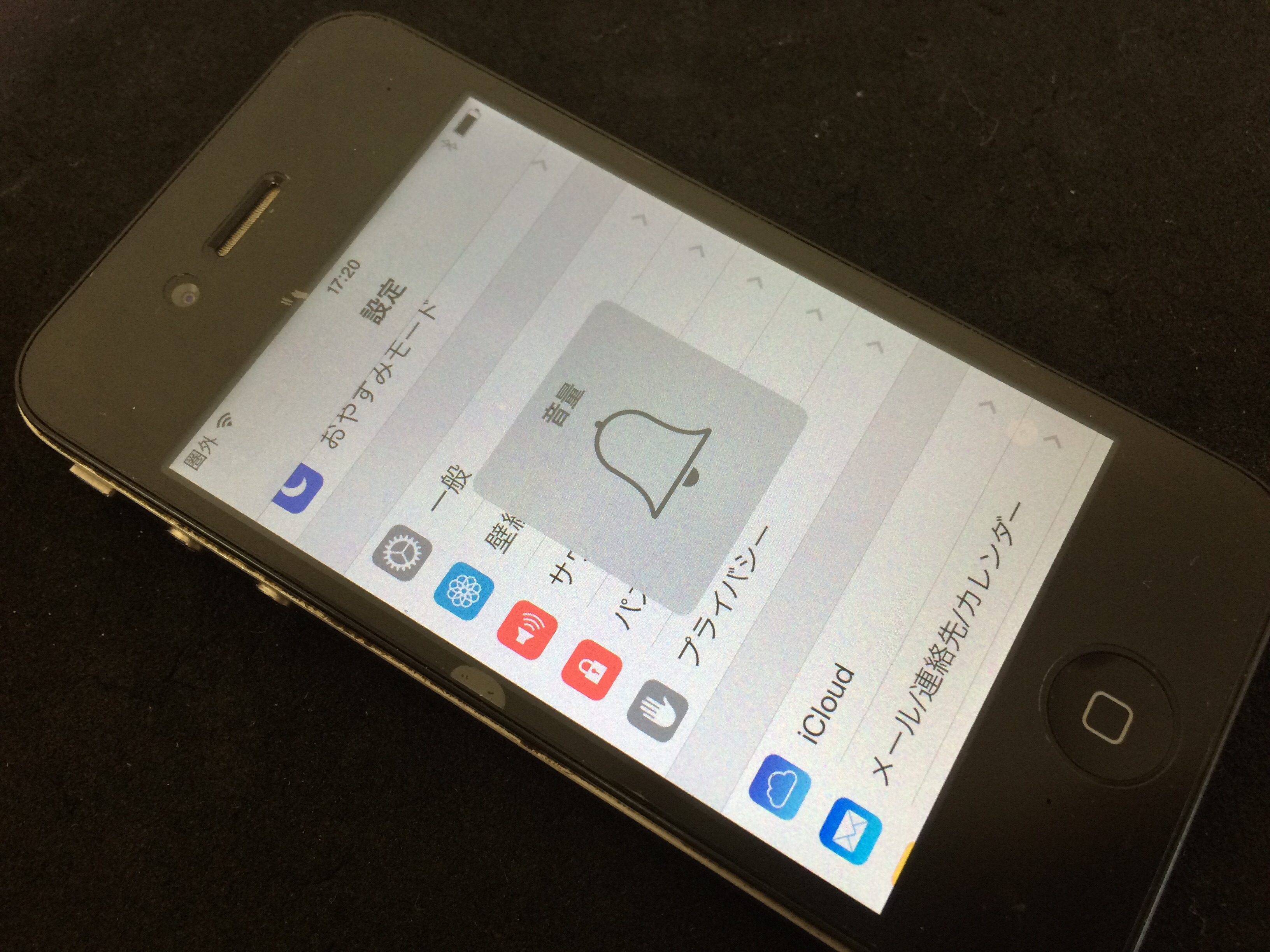 本体横の音量ボタンを押すと通常は音量バーが出てきますがこちらのiPhoneは画像のように音量バーが出ない状態で、イヤホンを挿すと通常通り音量バーが表示される状態でした。