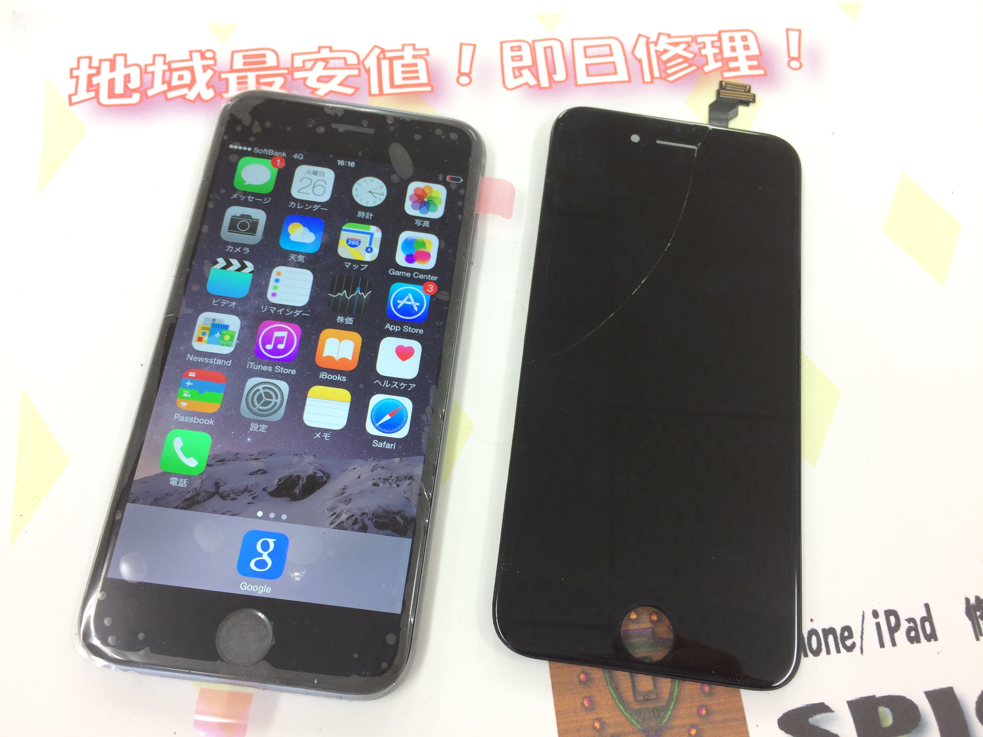 iPhone6 ガラス割れ、液晶修理 ¥19,800