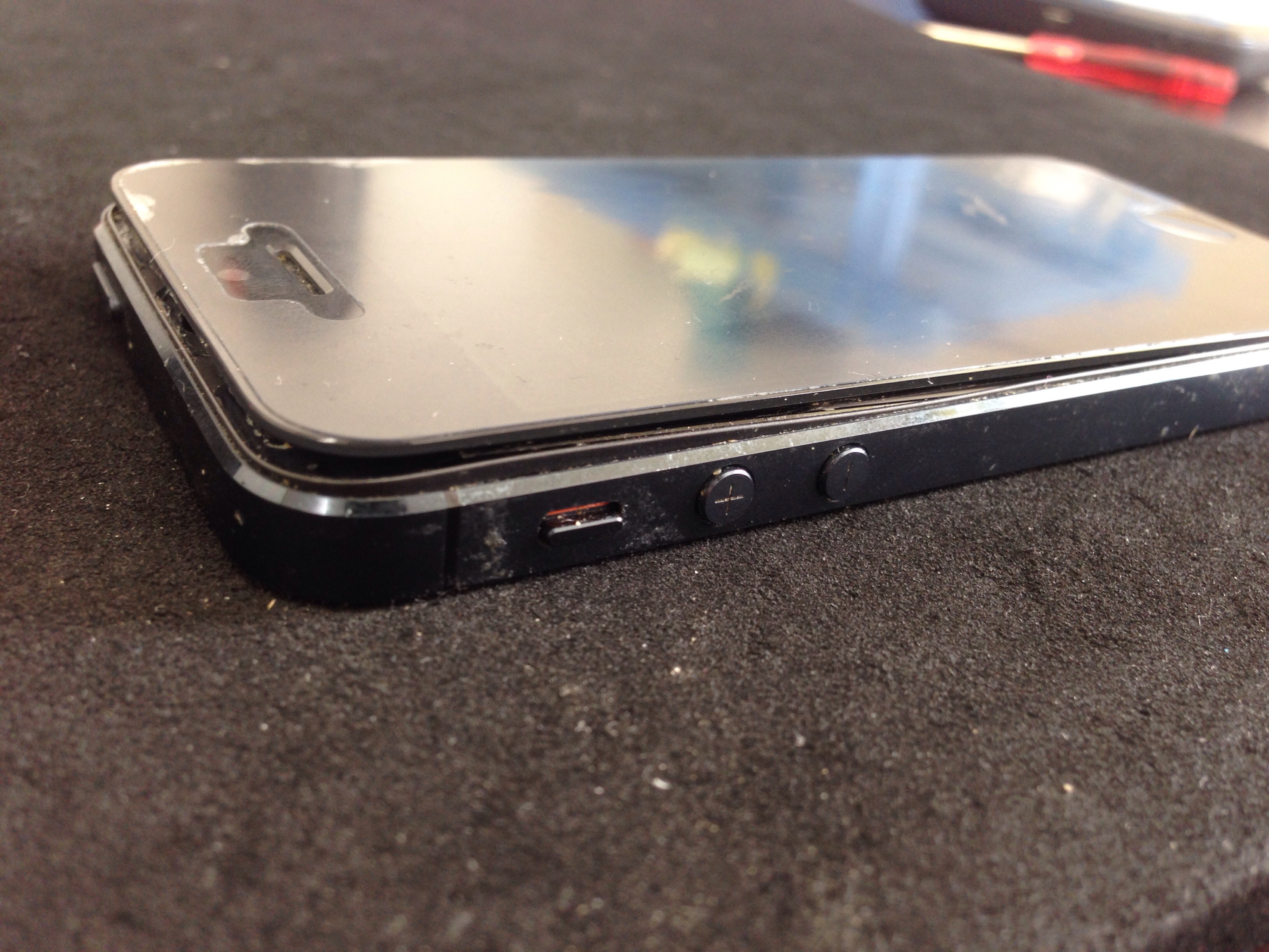 こちらのiPhoneはバッテリーが膨張し液晶パネルを内部から押し上げており、画像のように浮いており液晶の光が漏れている状態でした。