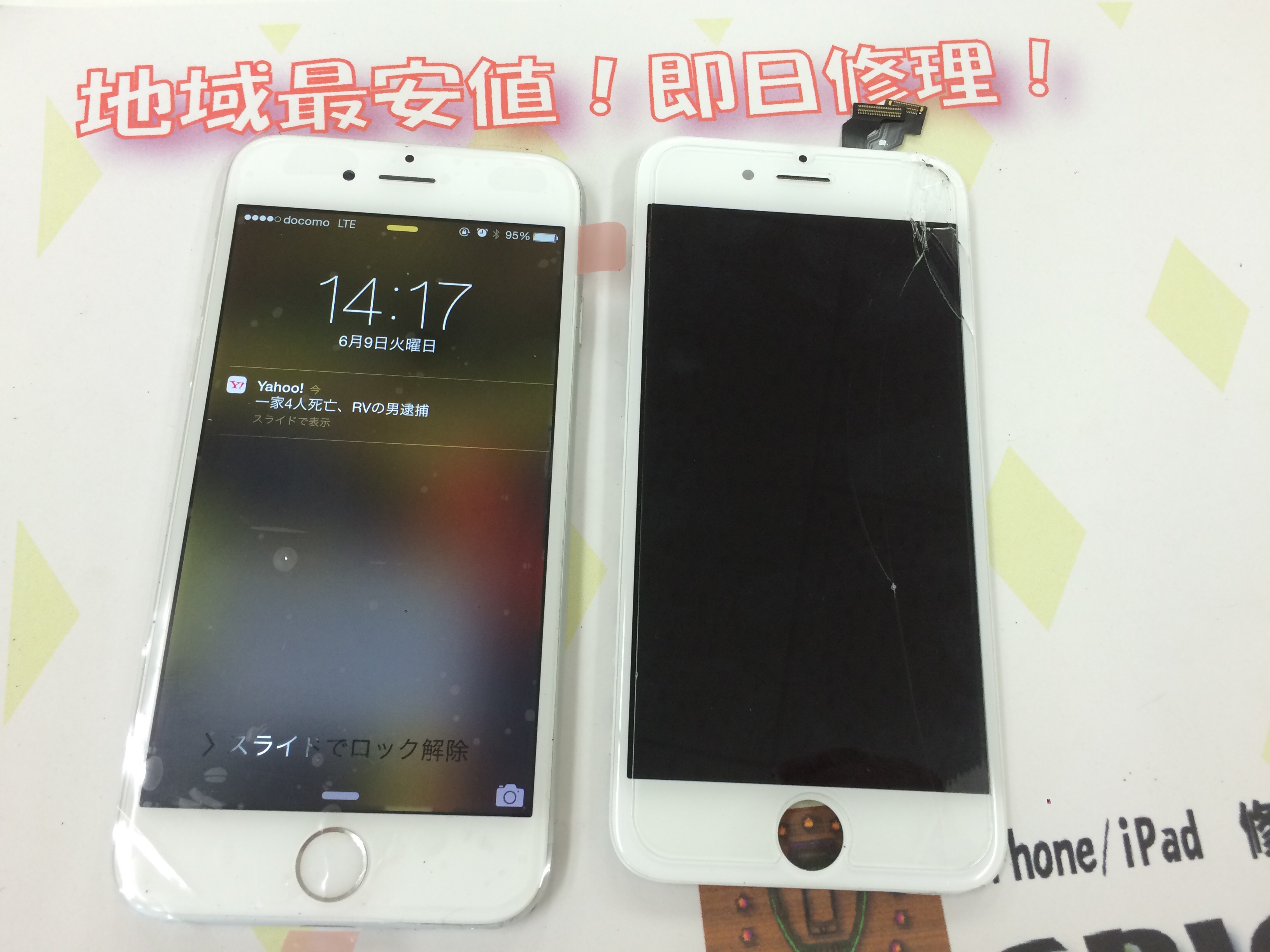 iPhone6 ガラス割れ、液晶修理 ¥19,300(Facebook割適用)