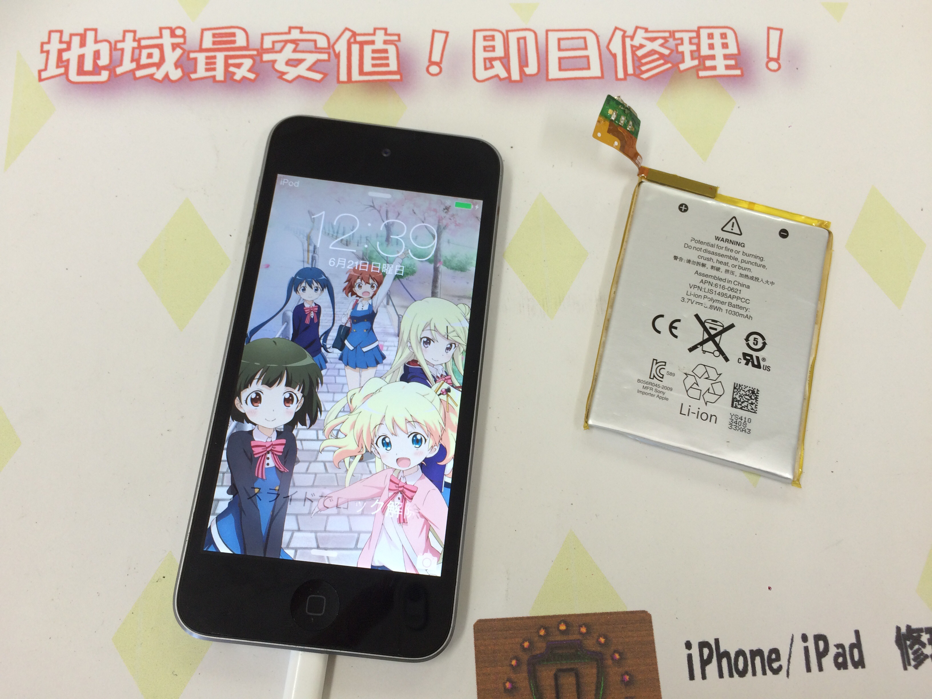 ※iPod touch5世代のバッテリー交換はパーツの在庫が安定していないのでまずはお問い合わせください。