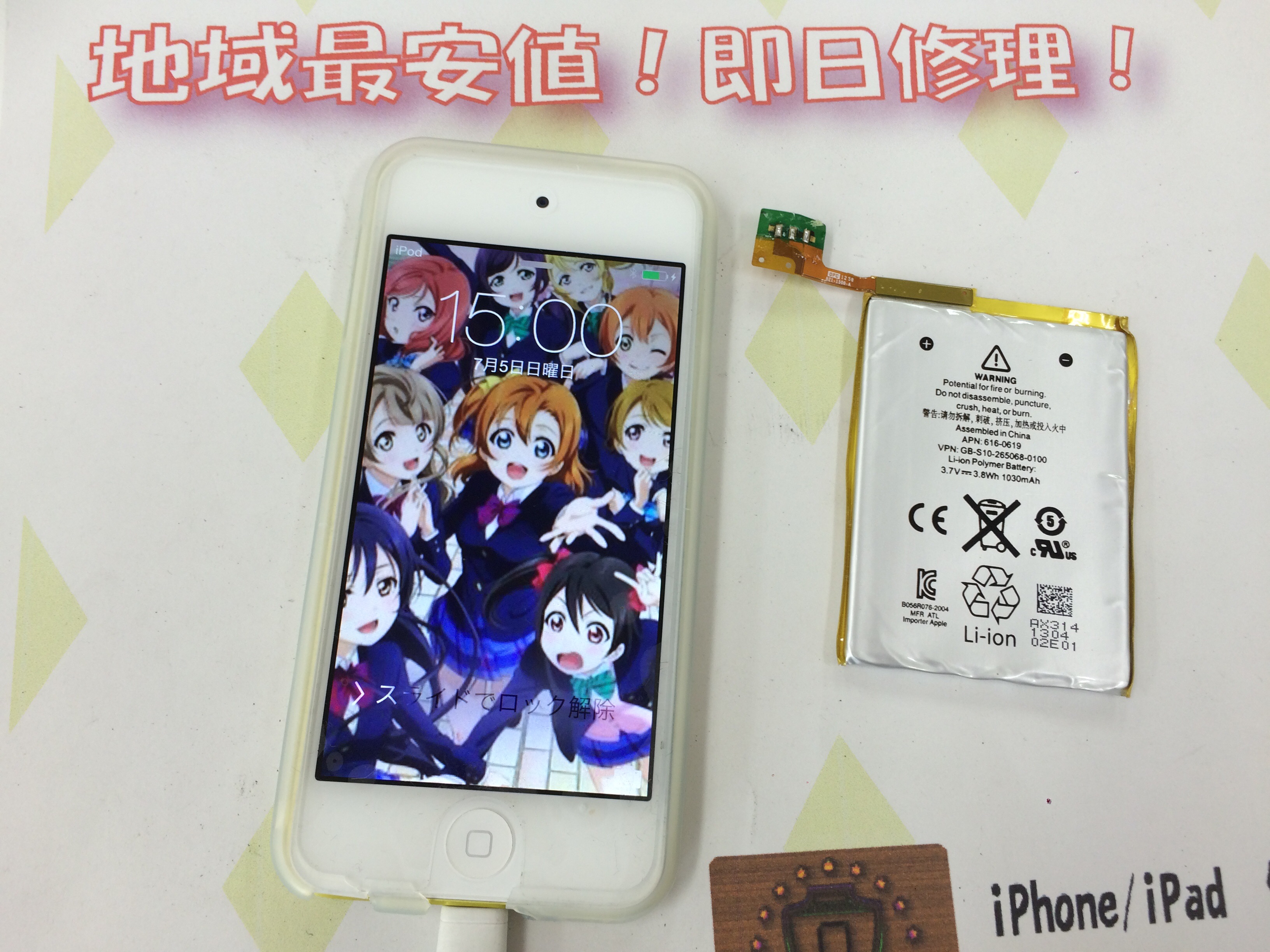 ※iPod touch5世代のバッテリー交換はパーツの在庫が安定していないのでまずはお問い合わせください。