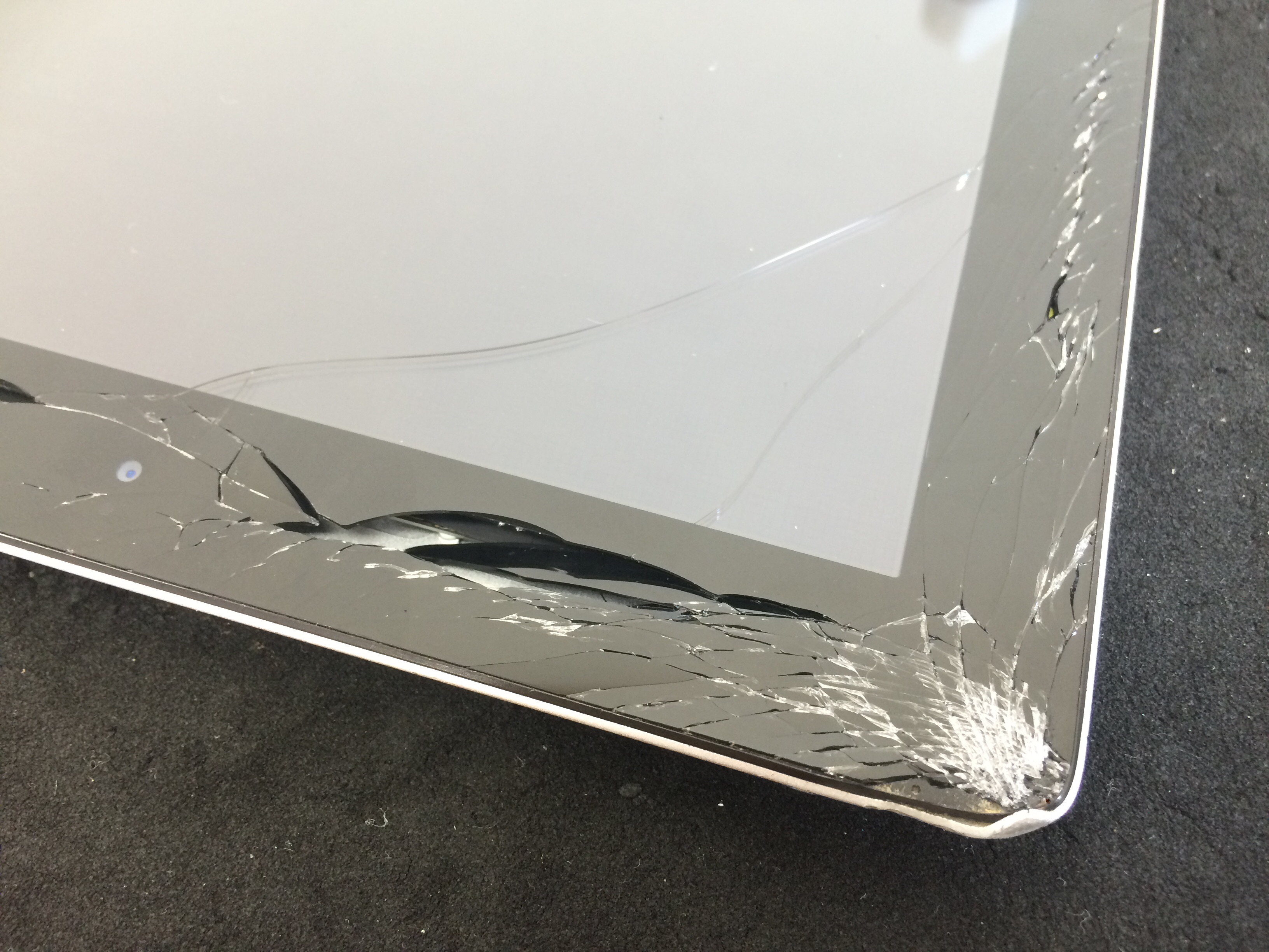 こちらのiPadは落下によりフレーム角が変形、ガラス割れとなっておりました。
