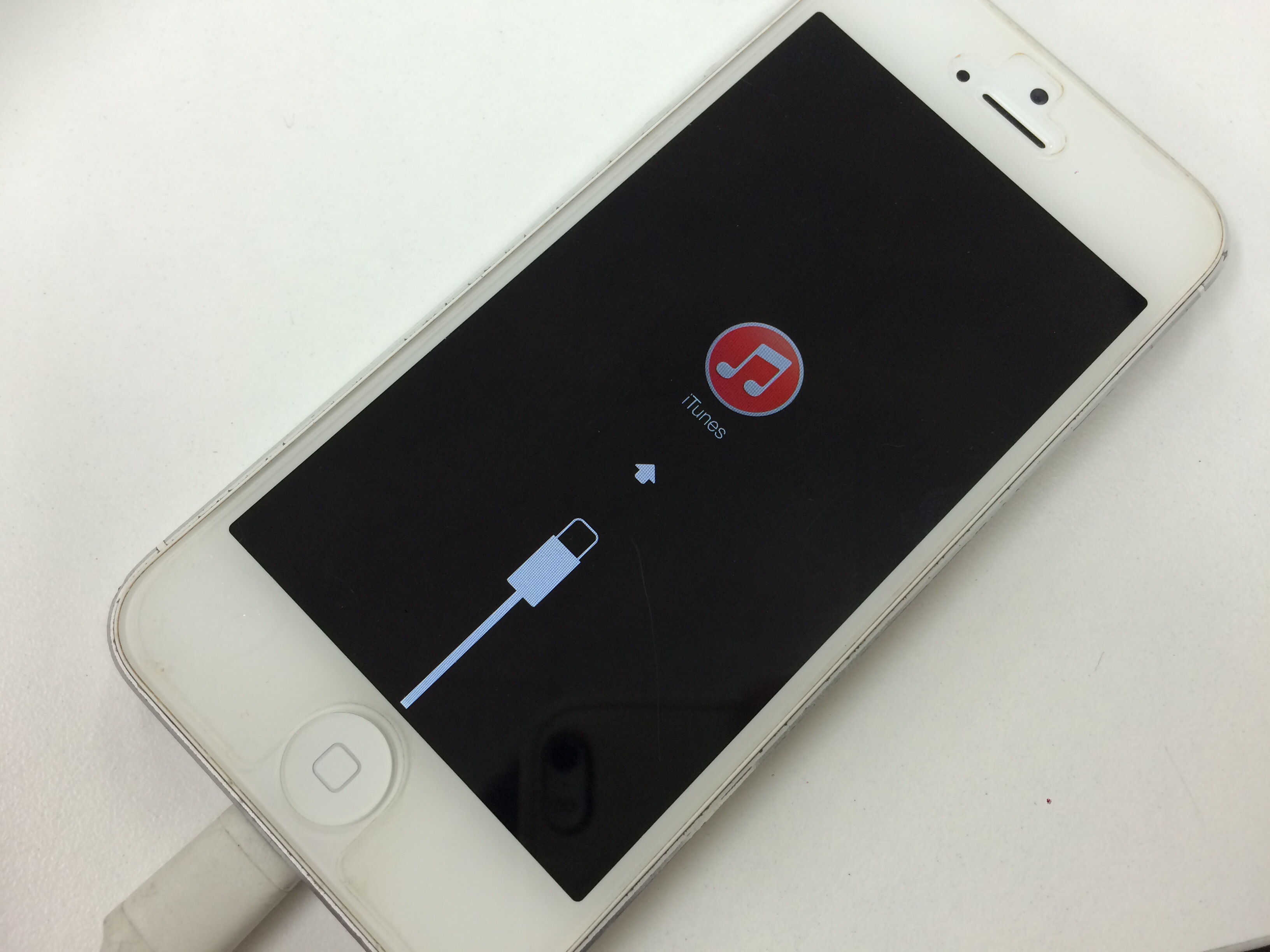 本体の確認を行うと充電ケーブルを繋ぐとリンゴマークが表示されすぐにiTunesに接続のリカバリーモードの画面が表示されました。