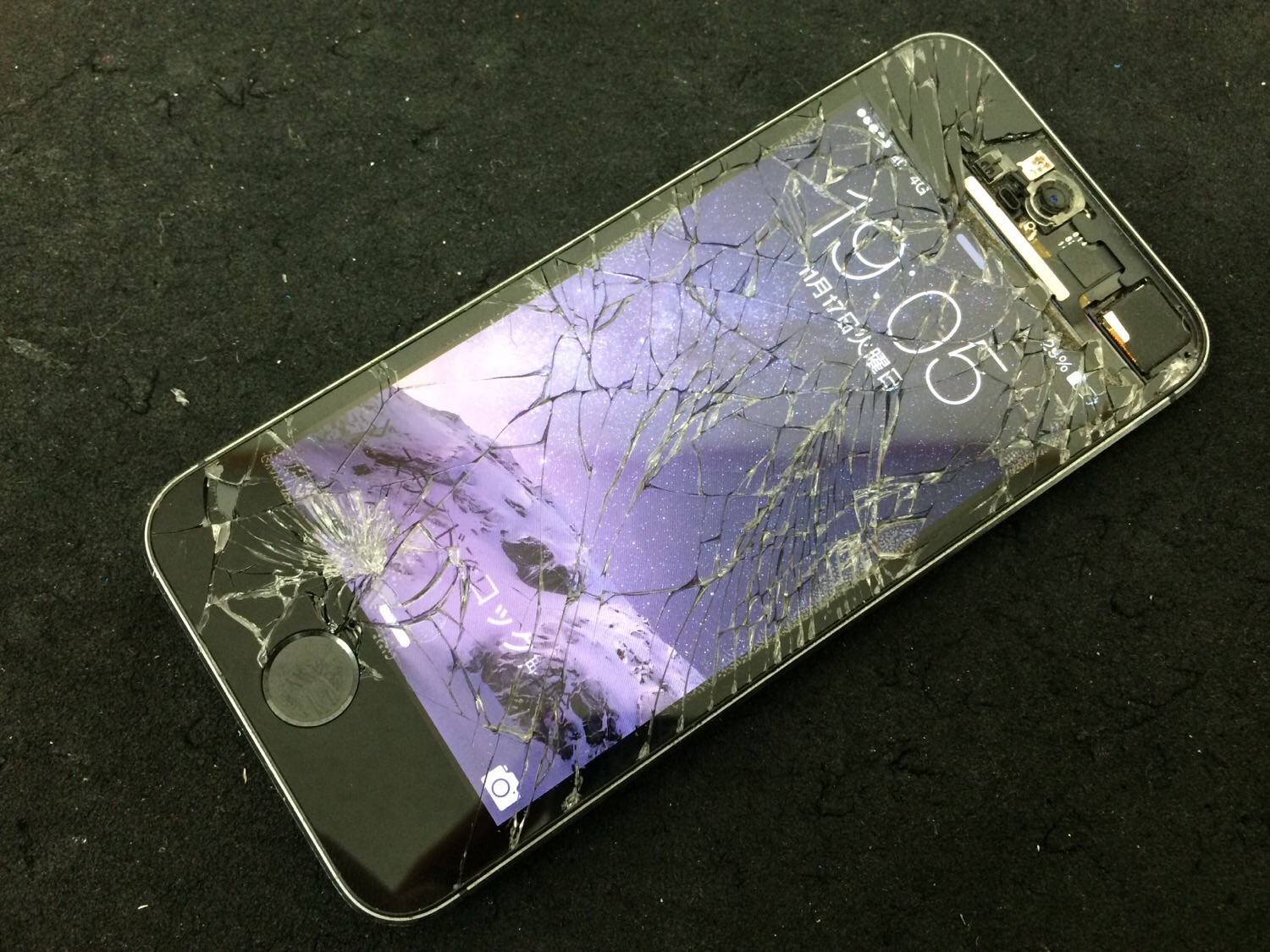 割れたままお使いだったようで画面上部のガラスが剥がれてしまいインカメラやアウトカメラ、イヤースピーカーなどの部品が露出している状態でした。