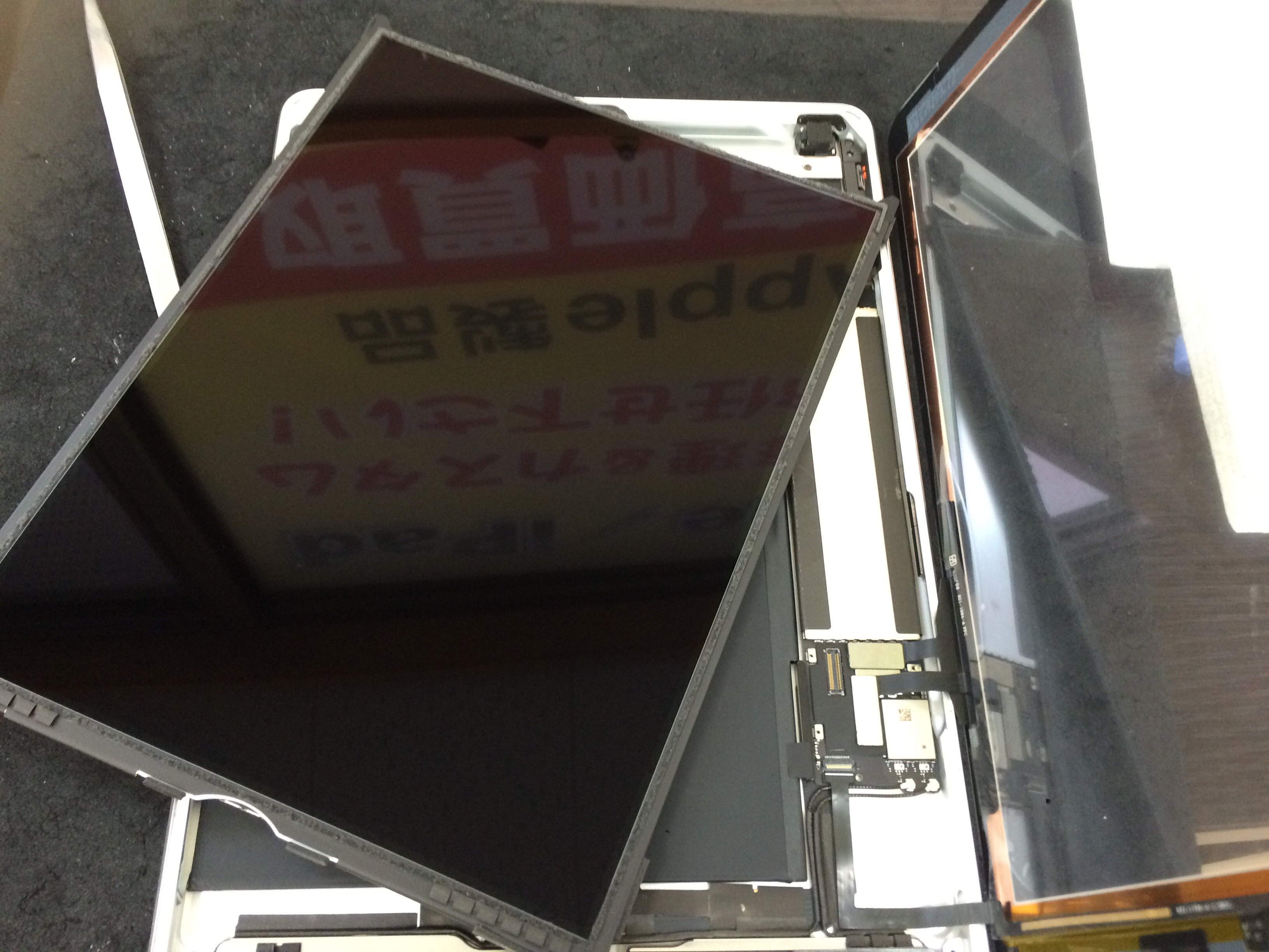 本体内部に入り込んでいるガラス片やフレームの汚れなどを綺麗にクリーニングし新しいフロントパネルにホームボタンなどパーツを移植し、仮付けで動作確認を行います。