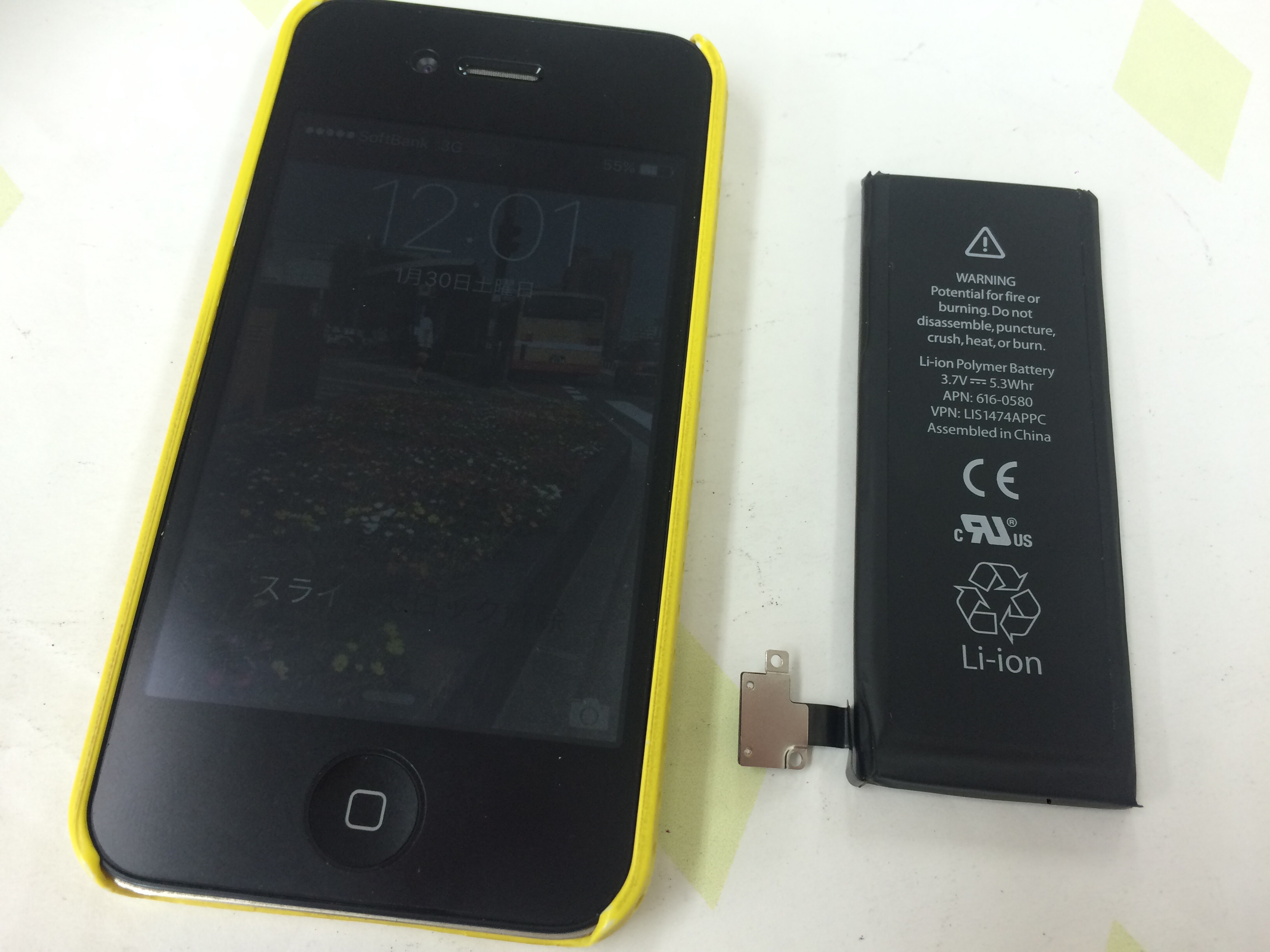 機種変更かバッテリーを交換し4sをまだ暫く使われるか迷っておられましたがバッテリー交換をしまだ使っていくとのことで新しいバッテリーに交換します。