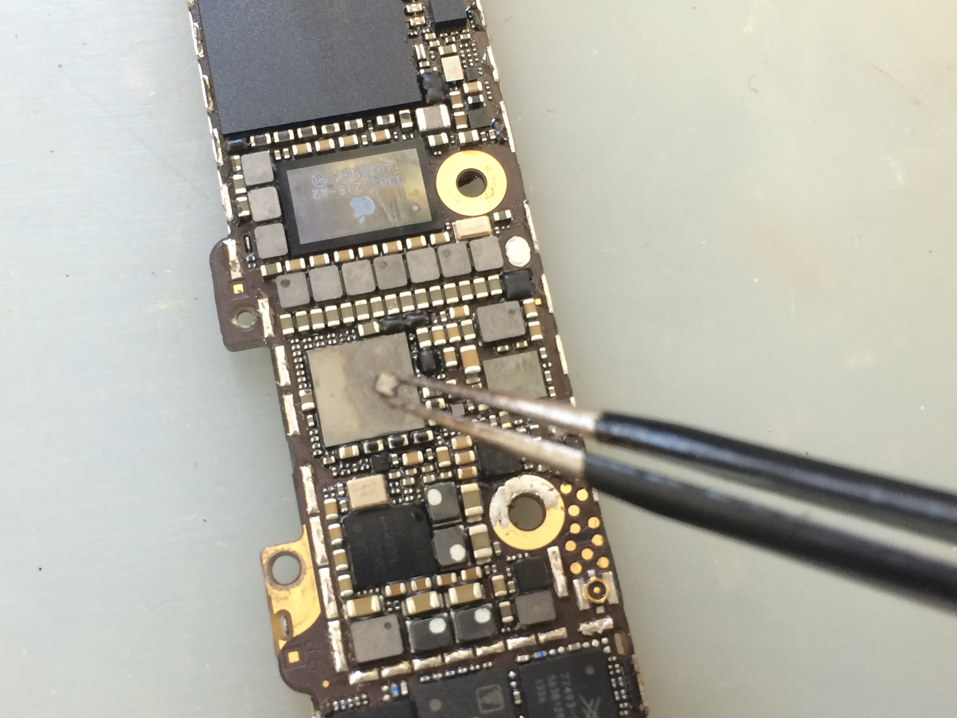 交換したICはピンセットの先につまんでいる非常に小さな物になります。