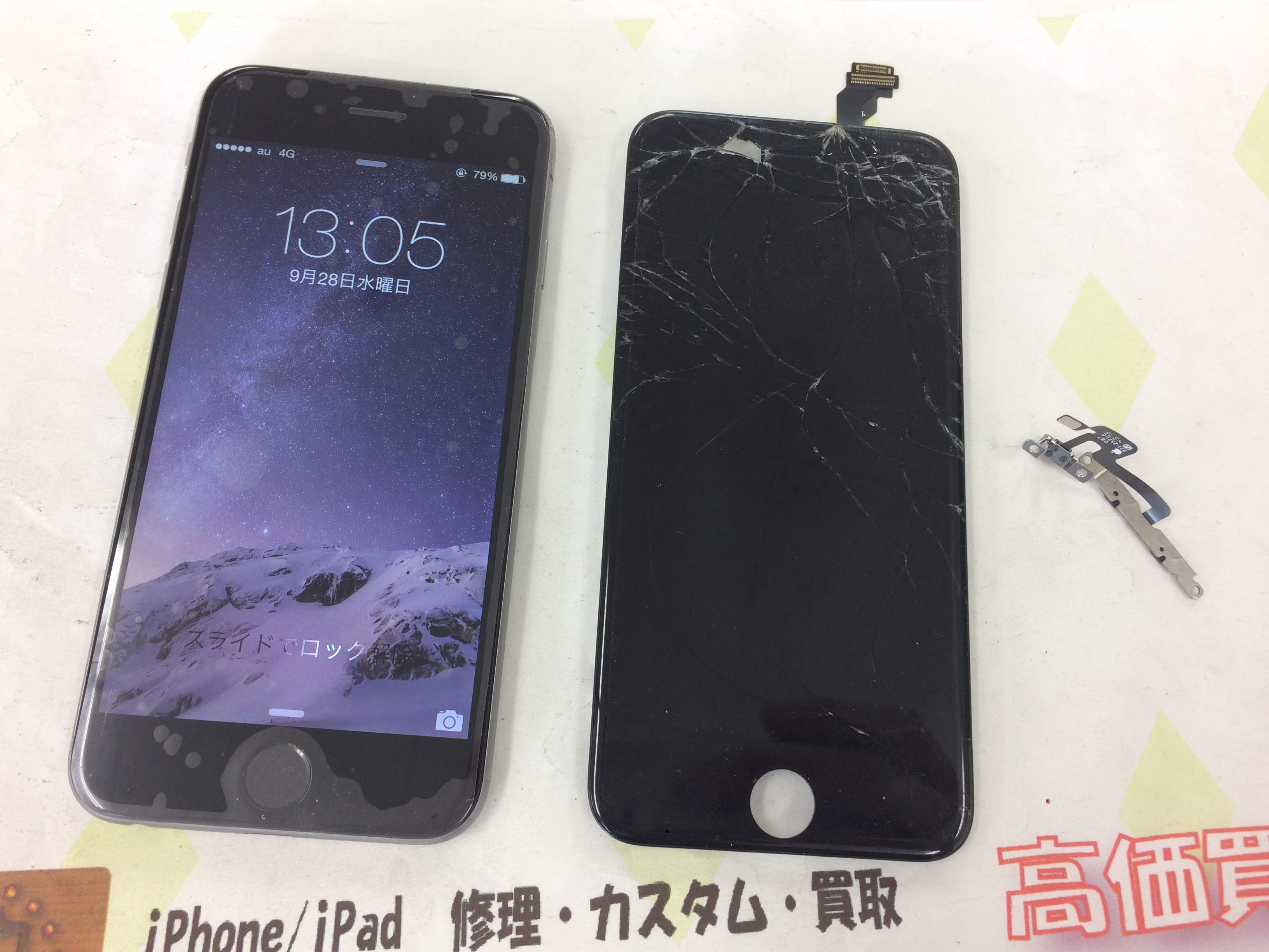 宝塚市よりiPhone6 画面割れ、マナースイッチ修理をご依頼いただきました。