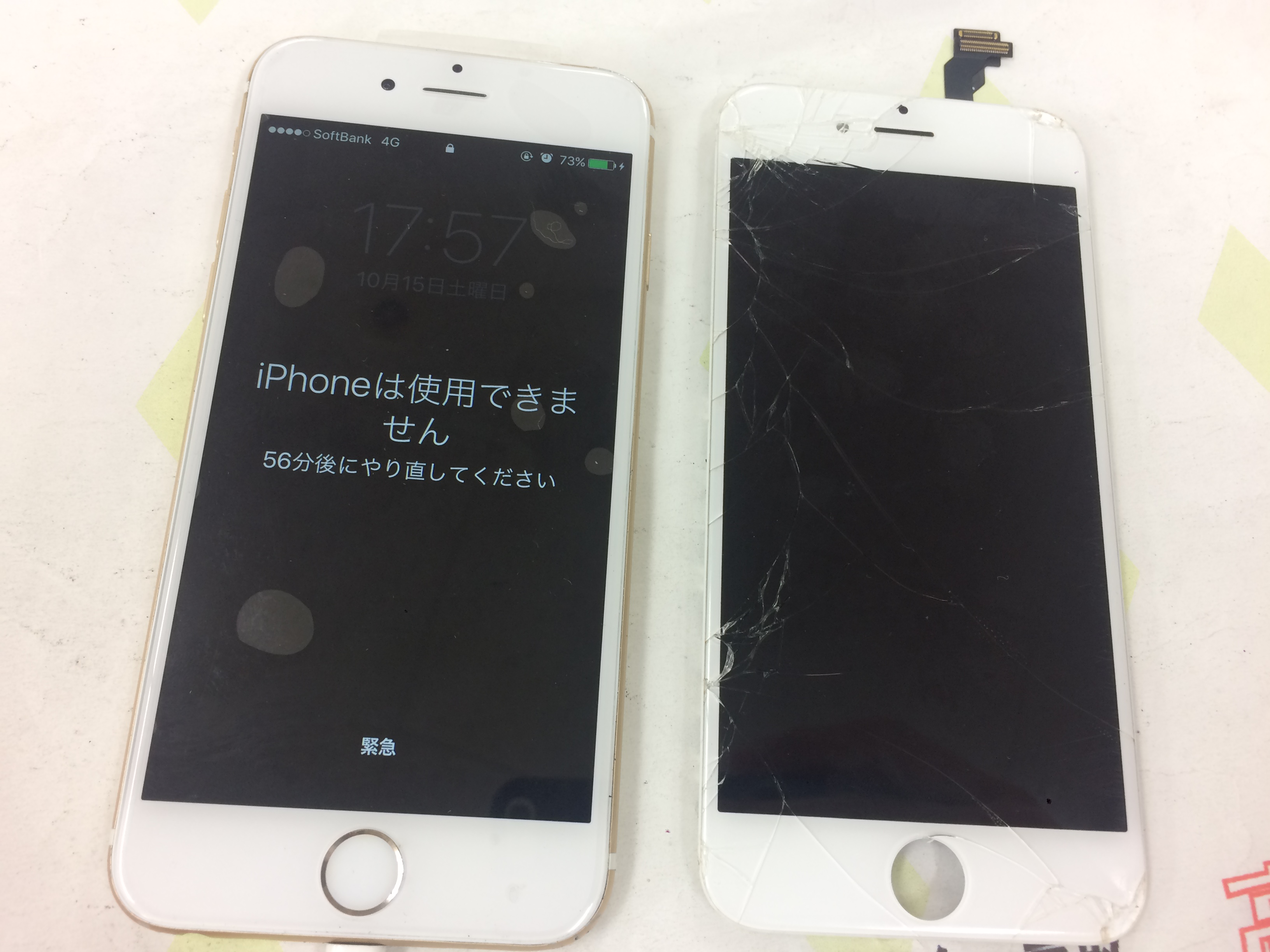 液晶表示はめちゃくちゃになっておりましたので受付時に新しい液晶に交換しデータが無事か確認するとタッチパネルの暴走によりパスコードが複数回勝手に打たれてしまい1時間後までロックがかかっている状態でした。
