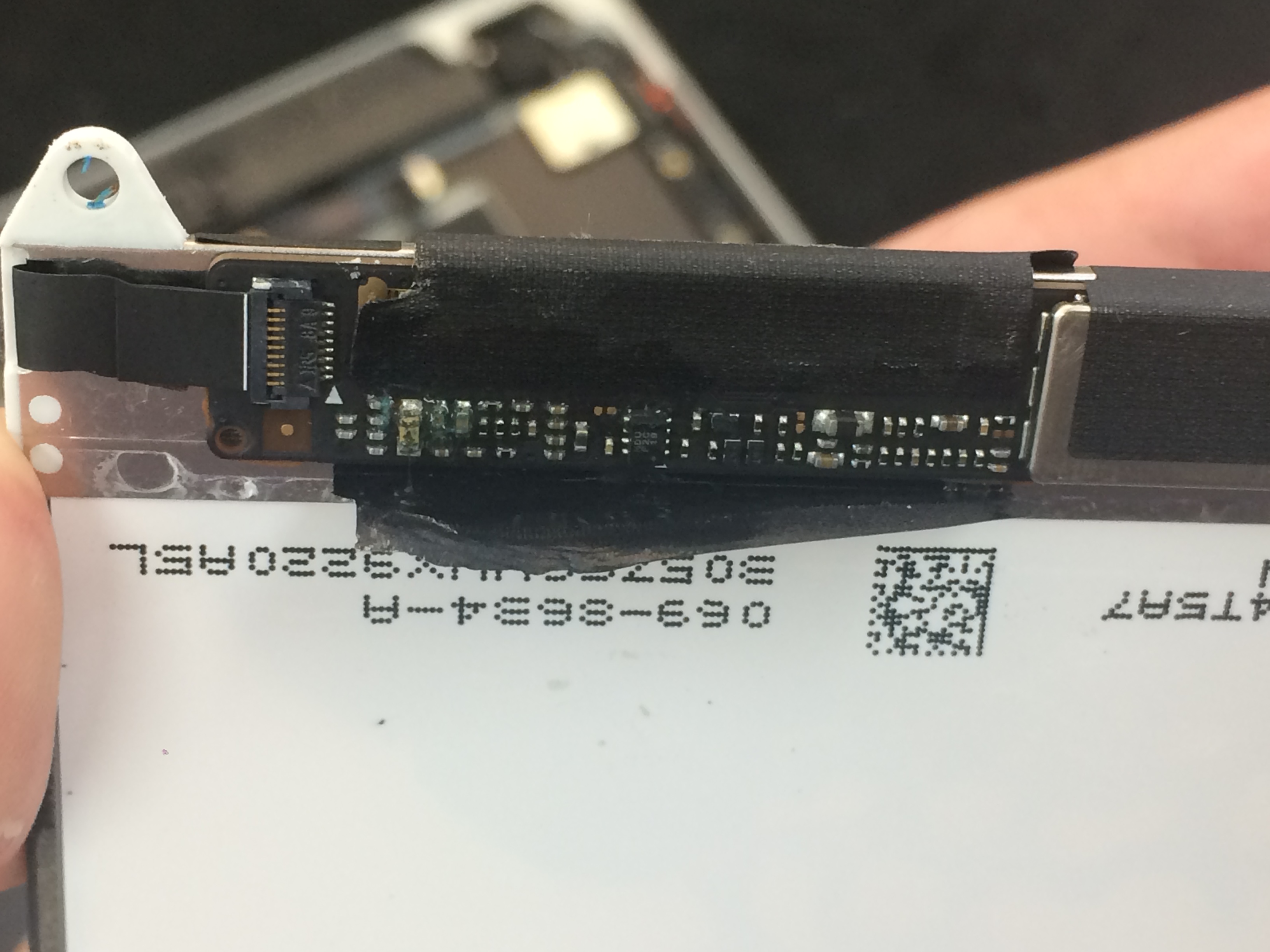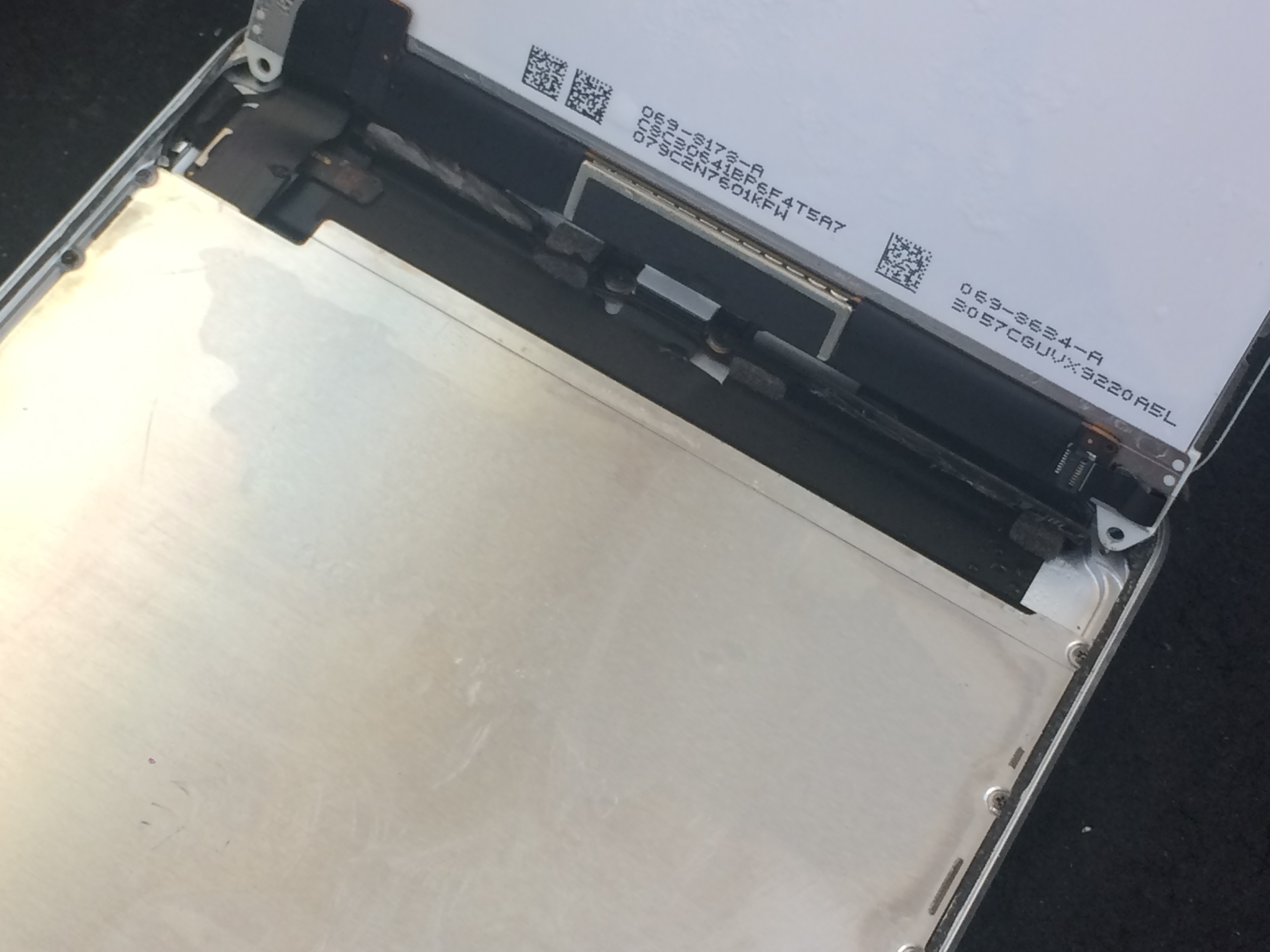 作業後、液晶パネル、タッチパネル、バッテリーの動作を行う為に当店の検証機に取り付けてみましたがバッテリーは電力不足で充電ケーブルを繋ぐと一瞬だけ電気が流れるがすぐに切れる状態、液晶、タッチパネルもどちらも動作不可でした。