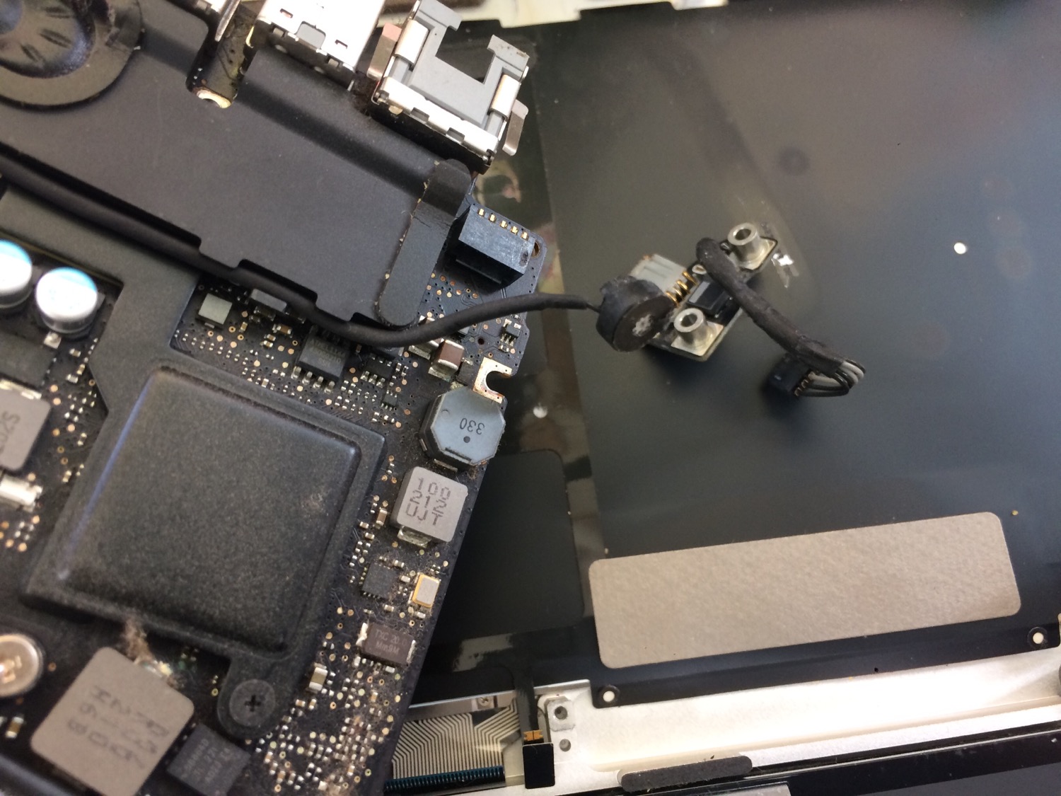 以前、iPhoneの修理をさせて頂いたお客様でお使いのMacbook Proの充電端子が破損し充電が出来なくなり起動しないとお預かりしておりました。