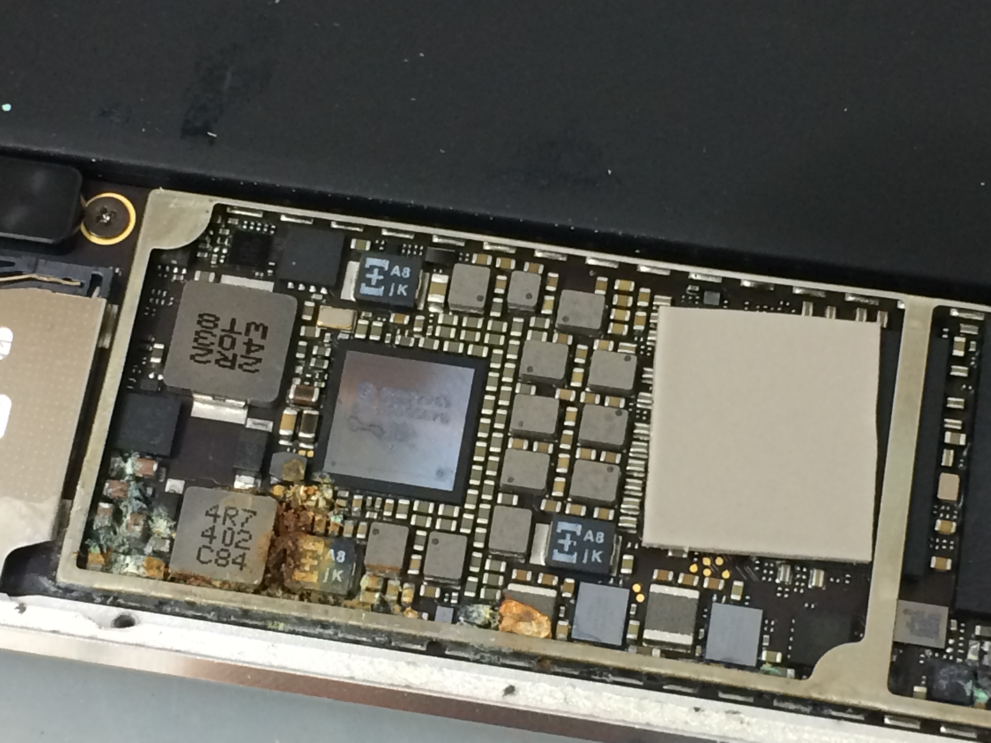 当店にて一通り作業を行い水没によりダメージを受けている液晶パネル、バッテリーを新しい物に交換し電源が入るか確認してみるもメインIC及び周辺回路が激しく損傷しており正常に起動しませんでした。