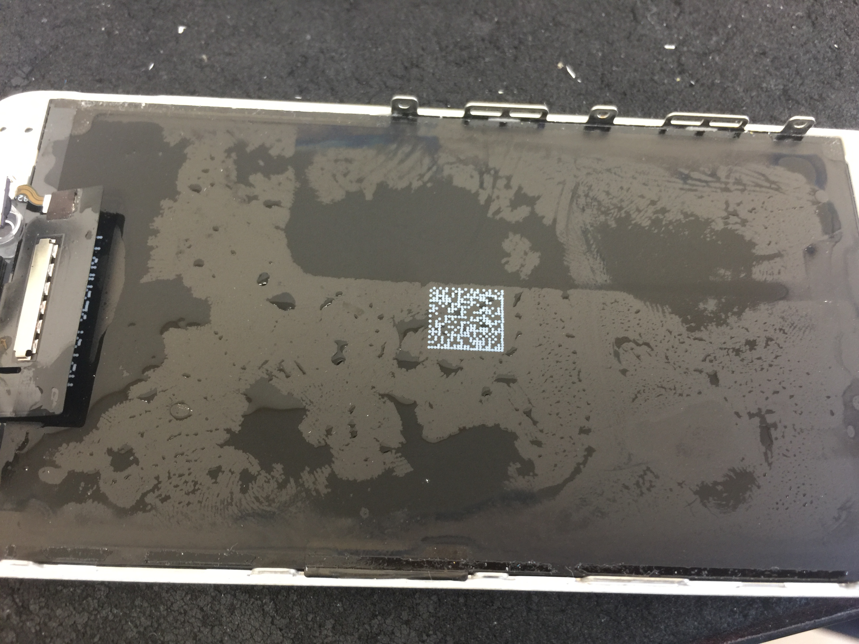 洗浄作業を行い、仮組みの状態で動作を確認すると液晶は表示されるものの起動時のアップルマークが残像で残りノイズが混じったような状態でした。