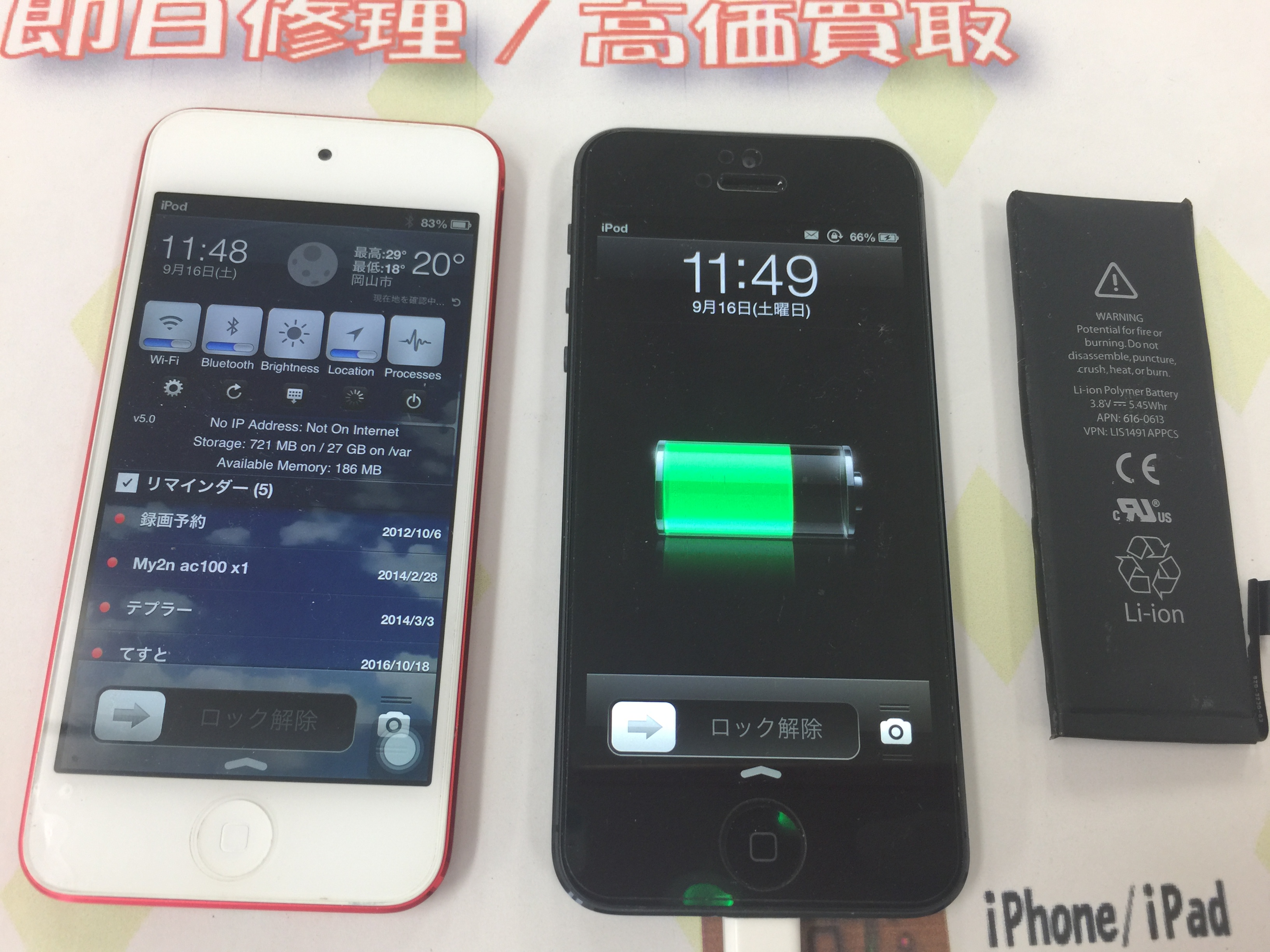 ◆岡山県よりiPhone5 バッテリー交換&iPod touch 5世代 ホームボタン修理 -2017 9/16-
