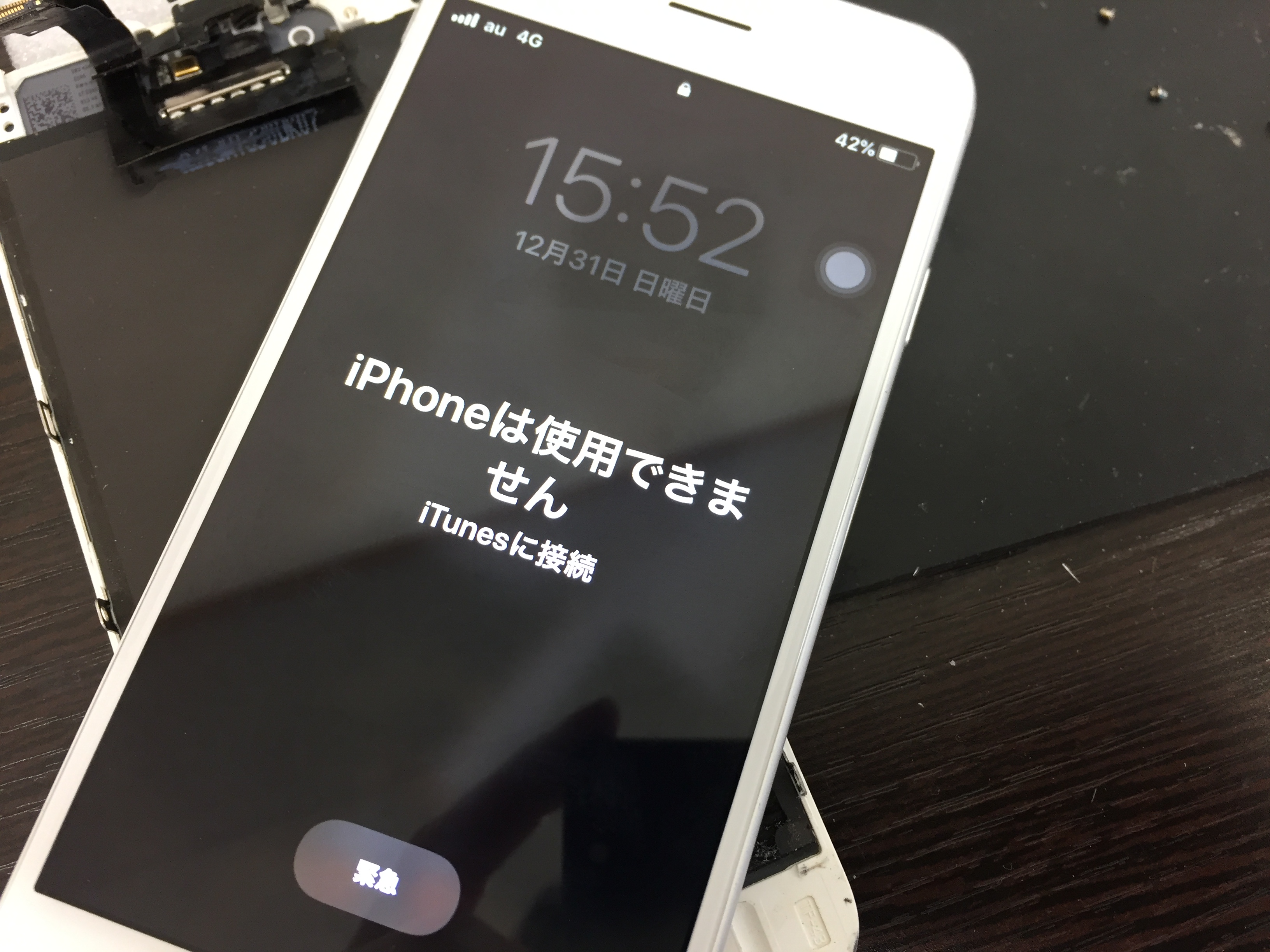 液晶パネル、バッテリーが損傷しており交換により起動はしたものの電源が切れる前にタッチパネルが暴走しパスコード画面で適当に入力されており画面にiPhoneは使用できませんの表示が。