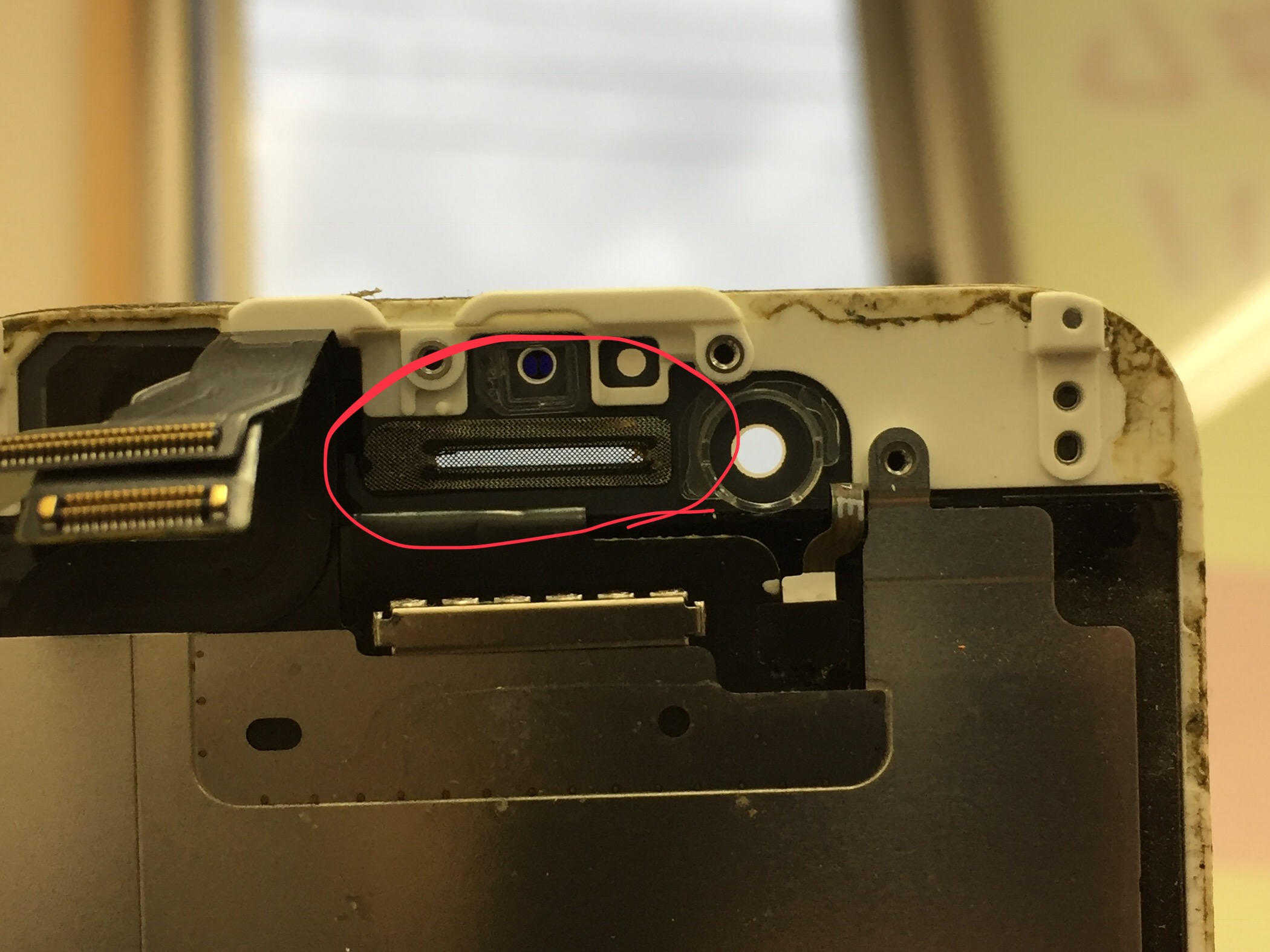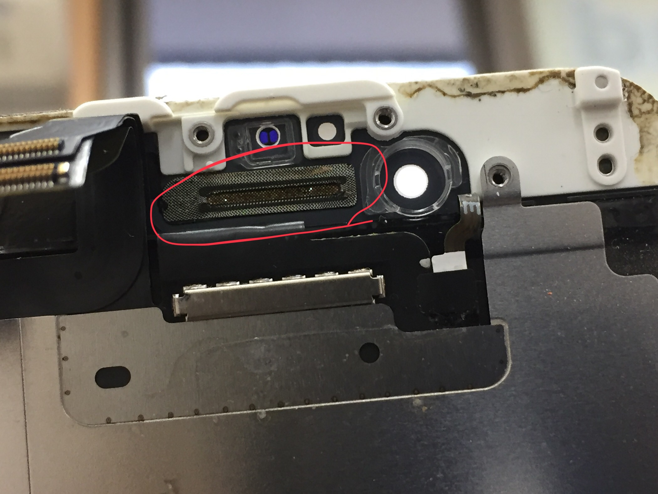 早速分解しスピーカーを取り外した状態でメッシュ部分を確認すると〇で囲ったメッシュ部分が汚れで全体が目詰まりしているのが確認出来ました。