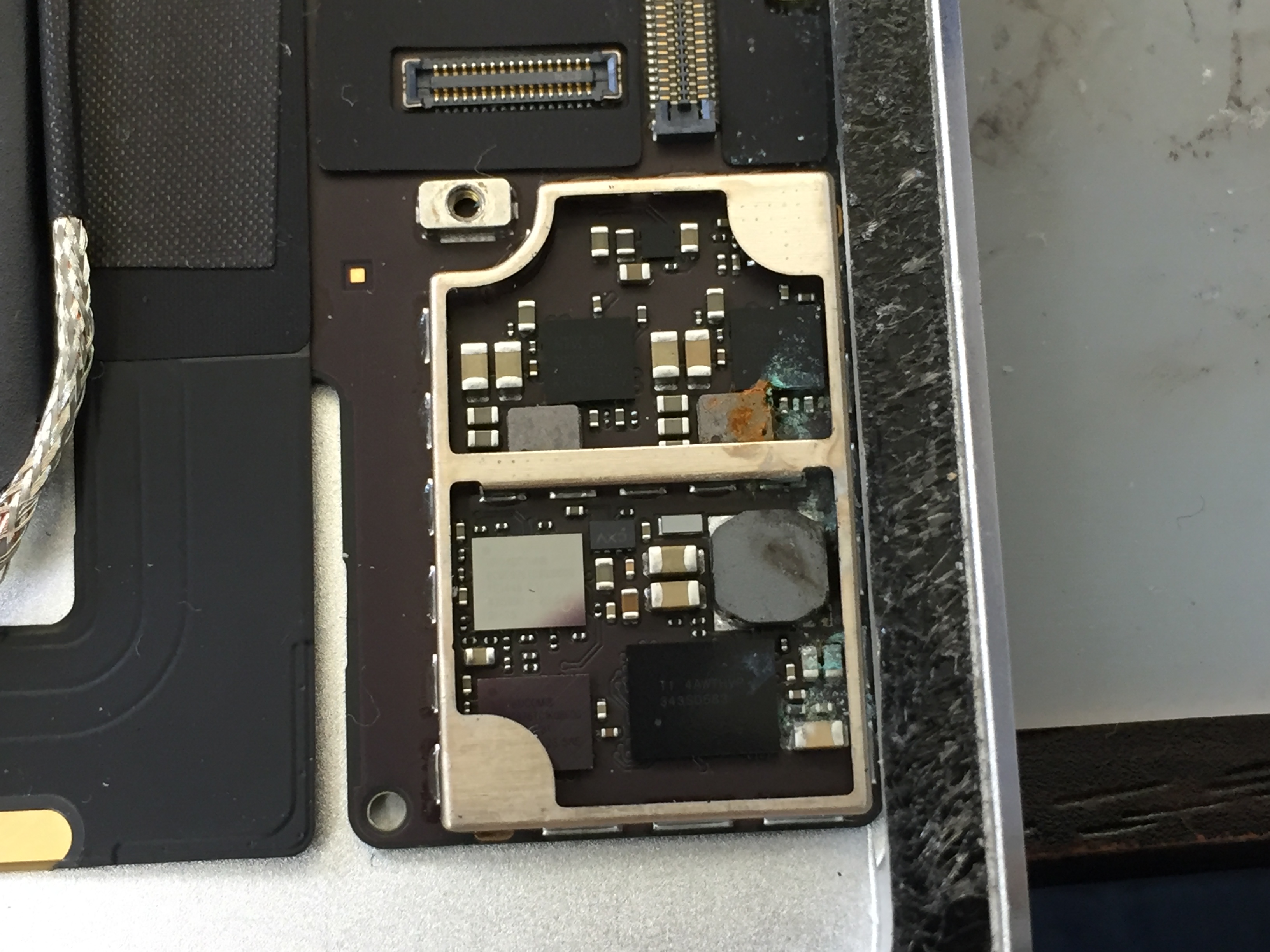 内部をチェックすると何か液体が進入した形跡があり、基板のシールドを外してみると完全にショートし焦げた跡が見受けられます。