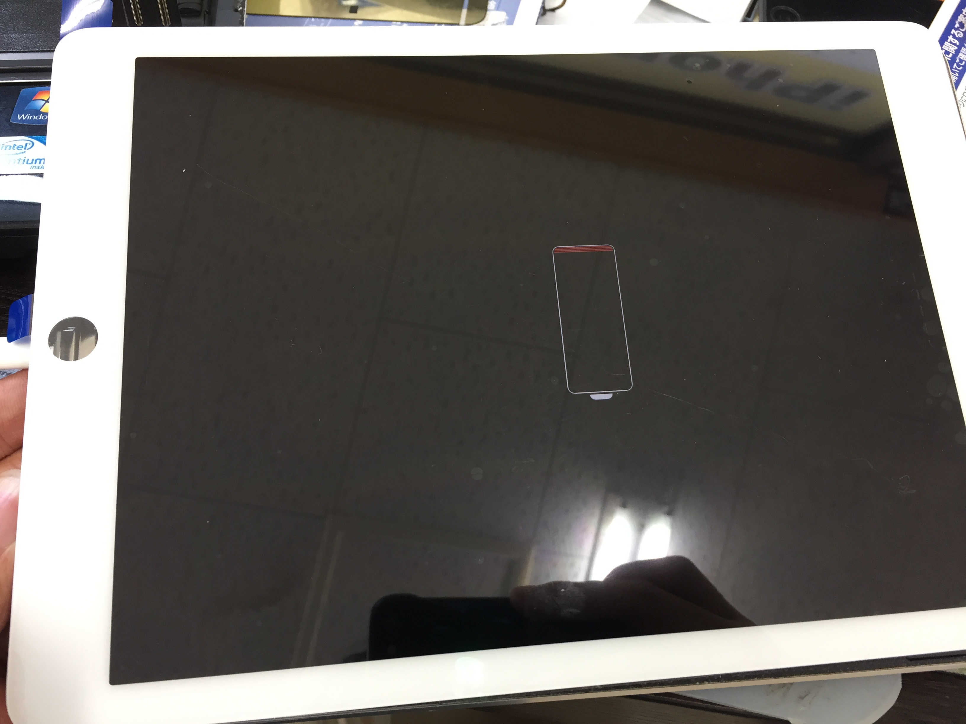 受付時にiTunesに接続するとiPadが認識されましたので電源は入っているようです。
