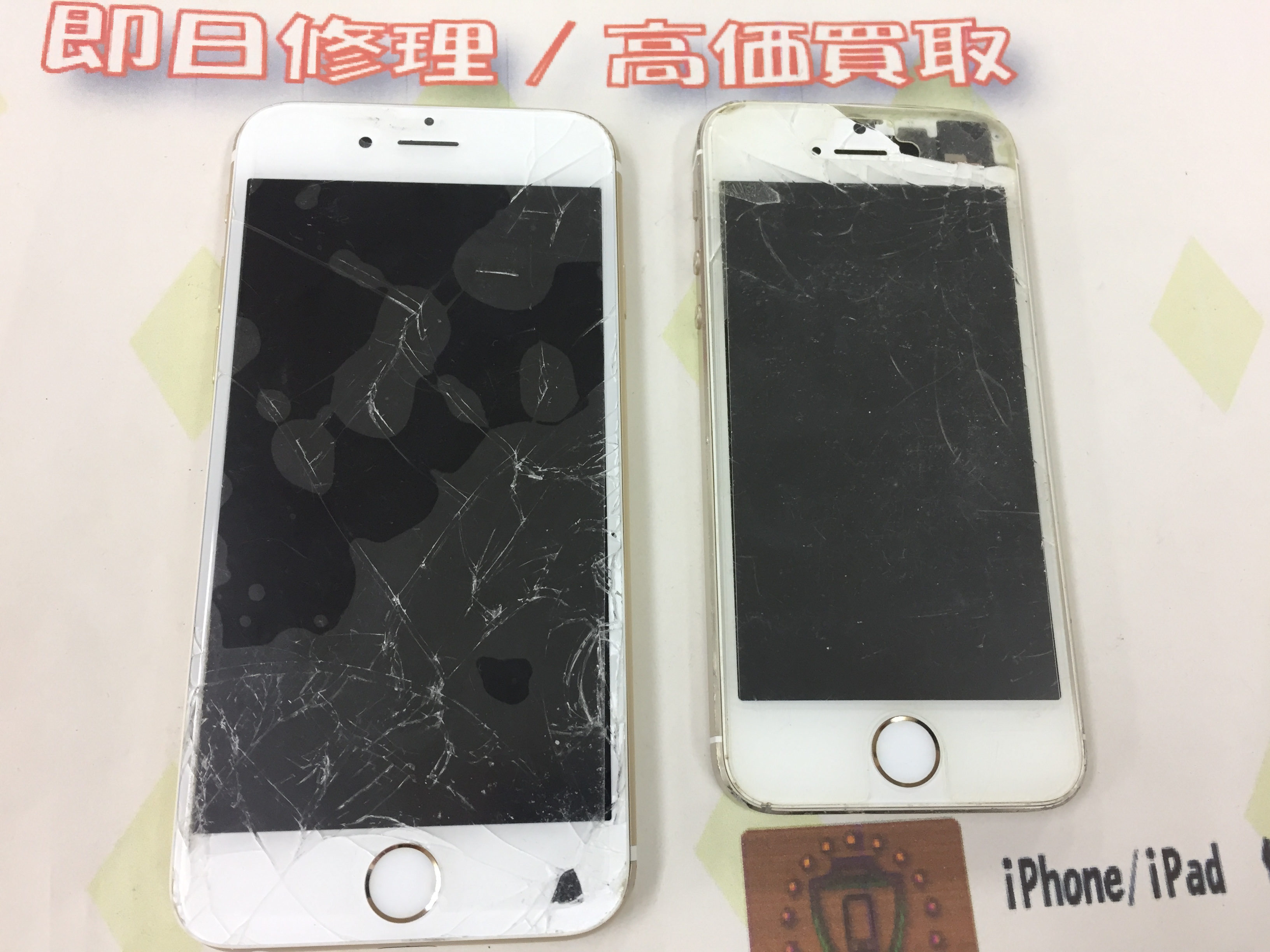どちらも画面全体が激しく割れており6sのほうは液晶表示不良の為操作出来ない&カメラのガラスも割れている状態でしたが問題なく買取が可能です。