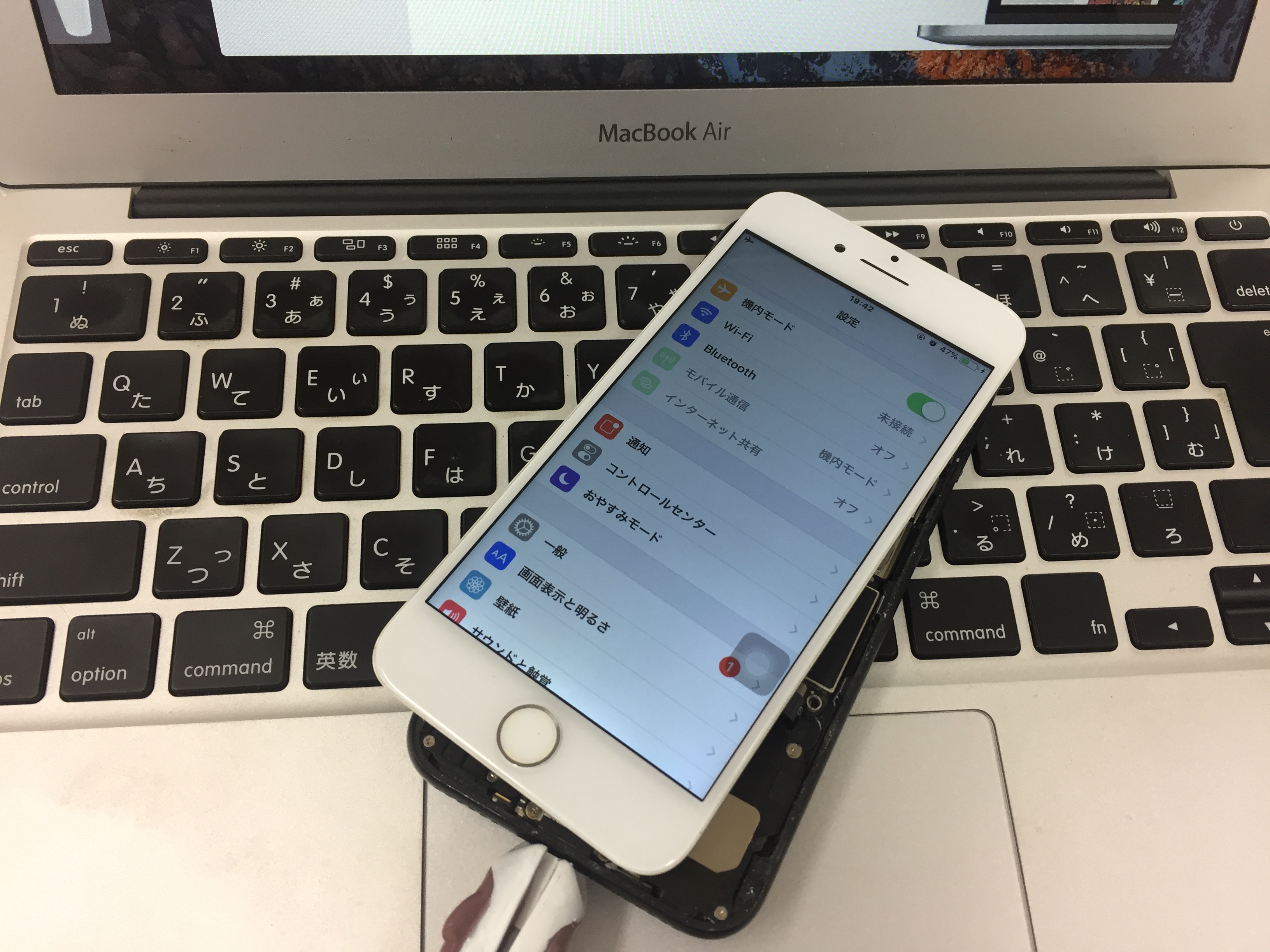 元の液晶パネル、バッテリーなどは完全に損傷しており使用できませんので当店のテストパーツを取り付け確認すると無事に起動致しました。