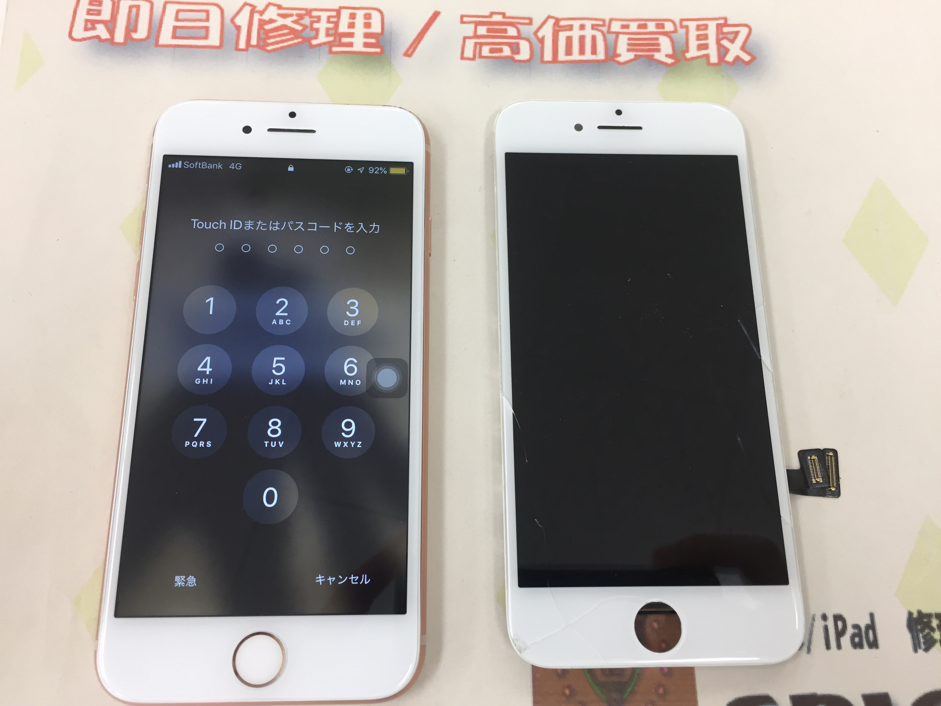 iPhone8 ガラス割れ、タッチパネル不良→互換パーツ修理 ¥9,300(税込)クーポン利用500円オフ