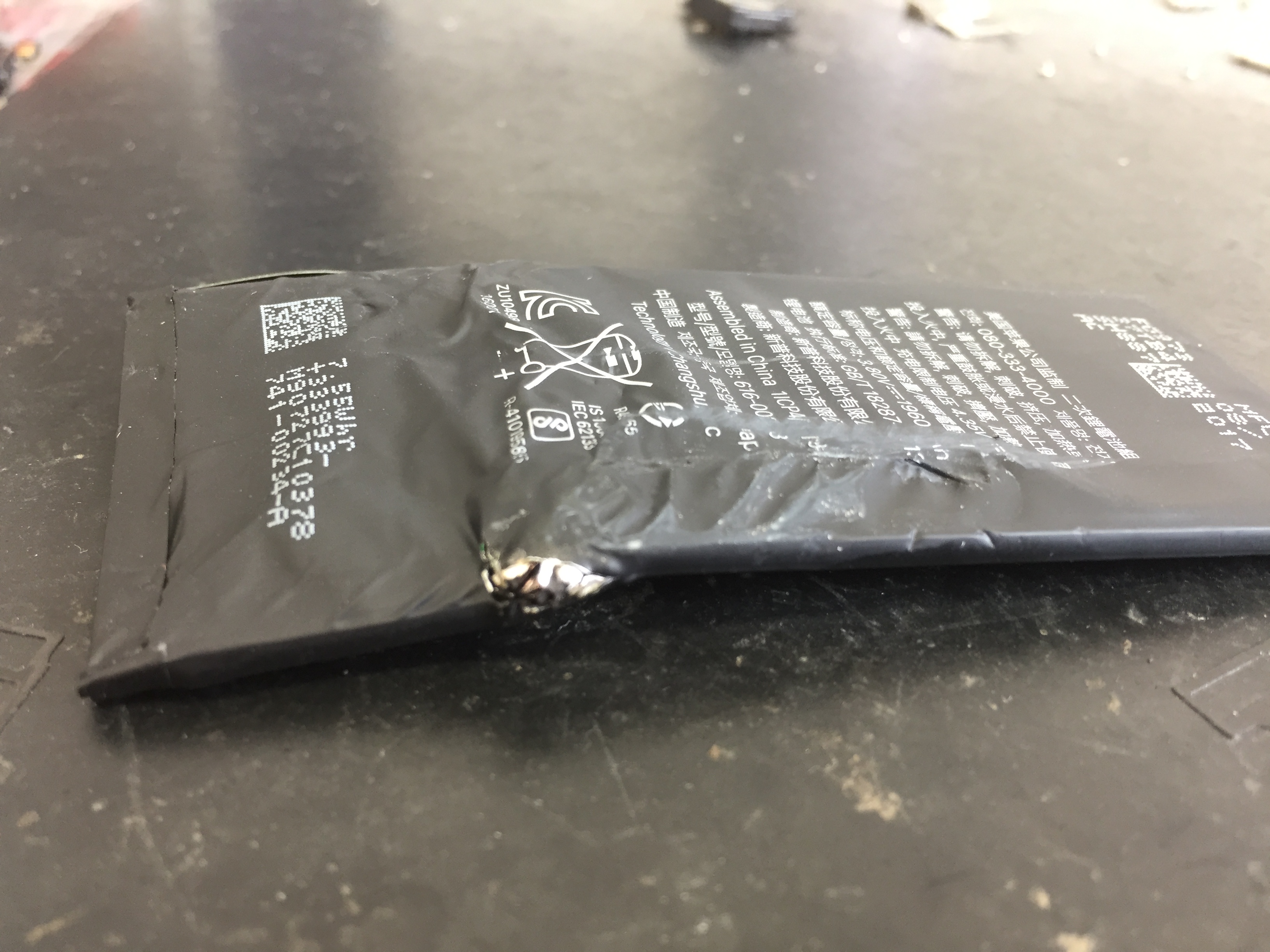 受付時に端末を確認させて頂くとバッテリーを固定しているテープの取り外しに失敗してしまったようで、バッテリーが大きく変形し一部穴が開いておりました。