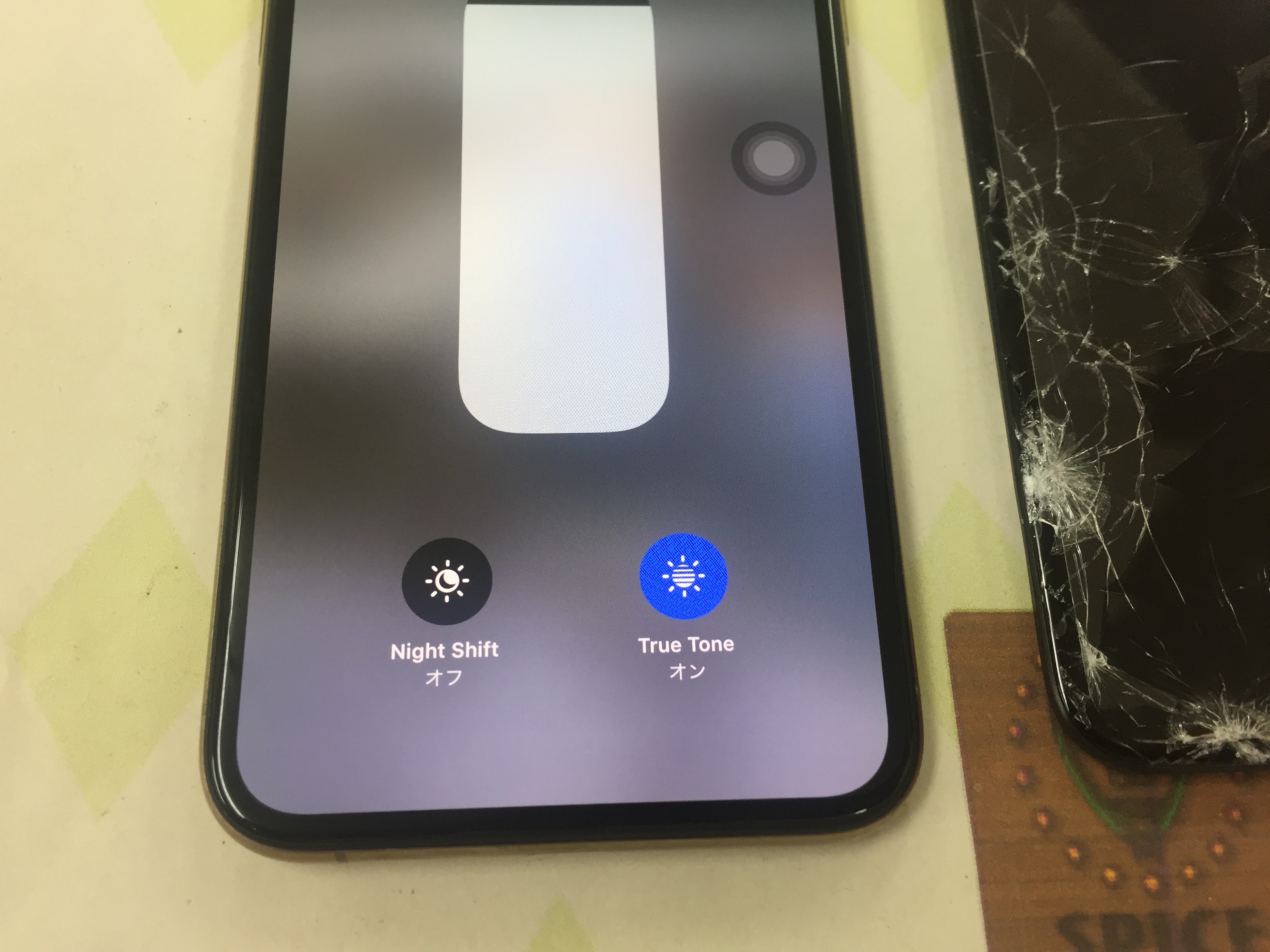 通常、画面の修理を行うと設定→画面表示と明るさ→True Toneという機能が消えてしまいますが当店では画面の修理後もこちらの機能を残したまま修理が可能です。