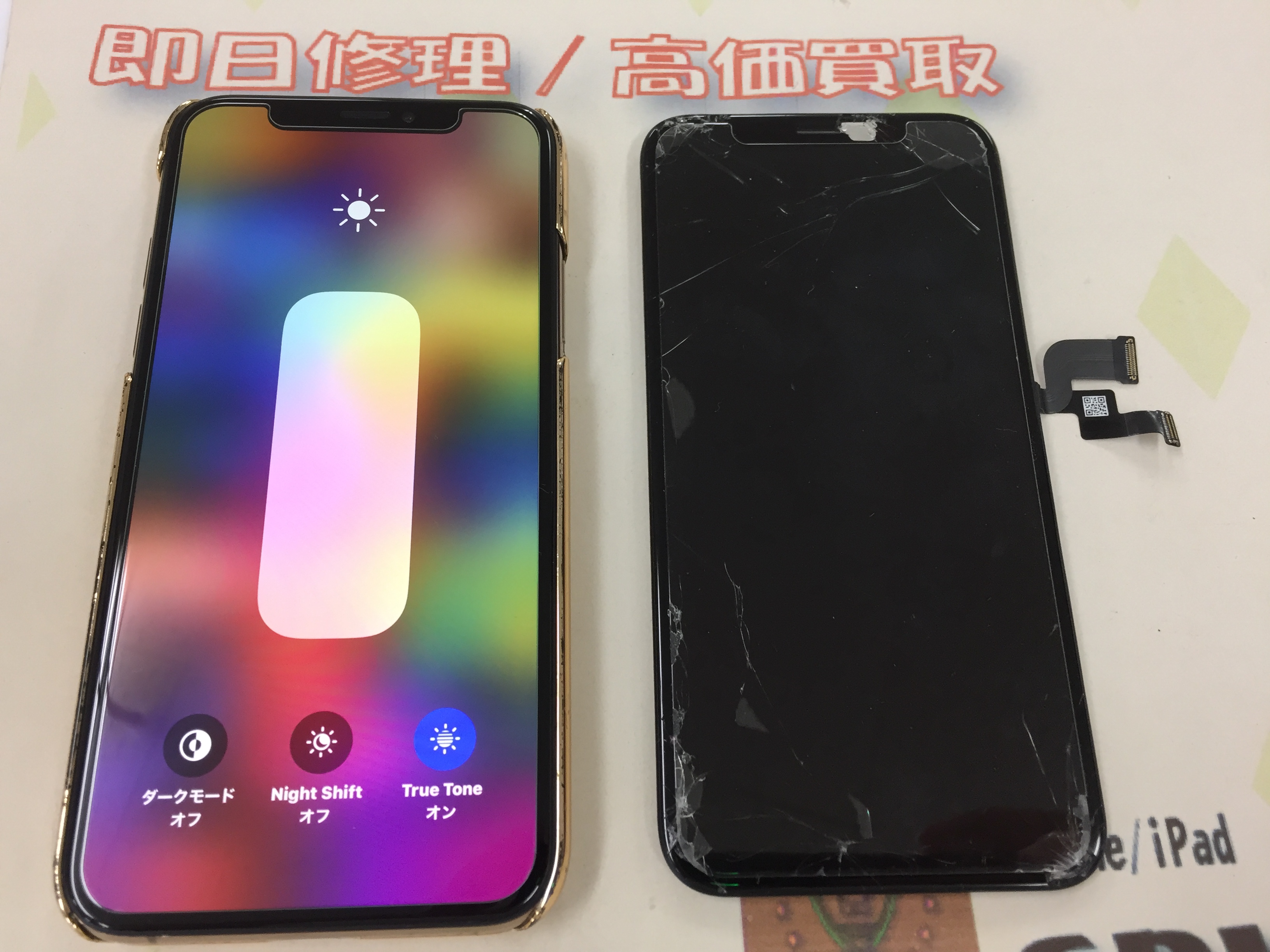 通常、画面の修理を行うと設定→画面表示と明るさ→True Toneという機能が消えてしまいますが当店では画面の修理後もこちらの機能を残したまま修理が可能です。