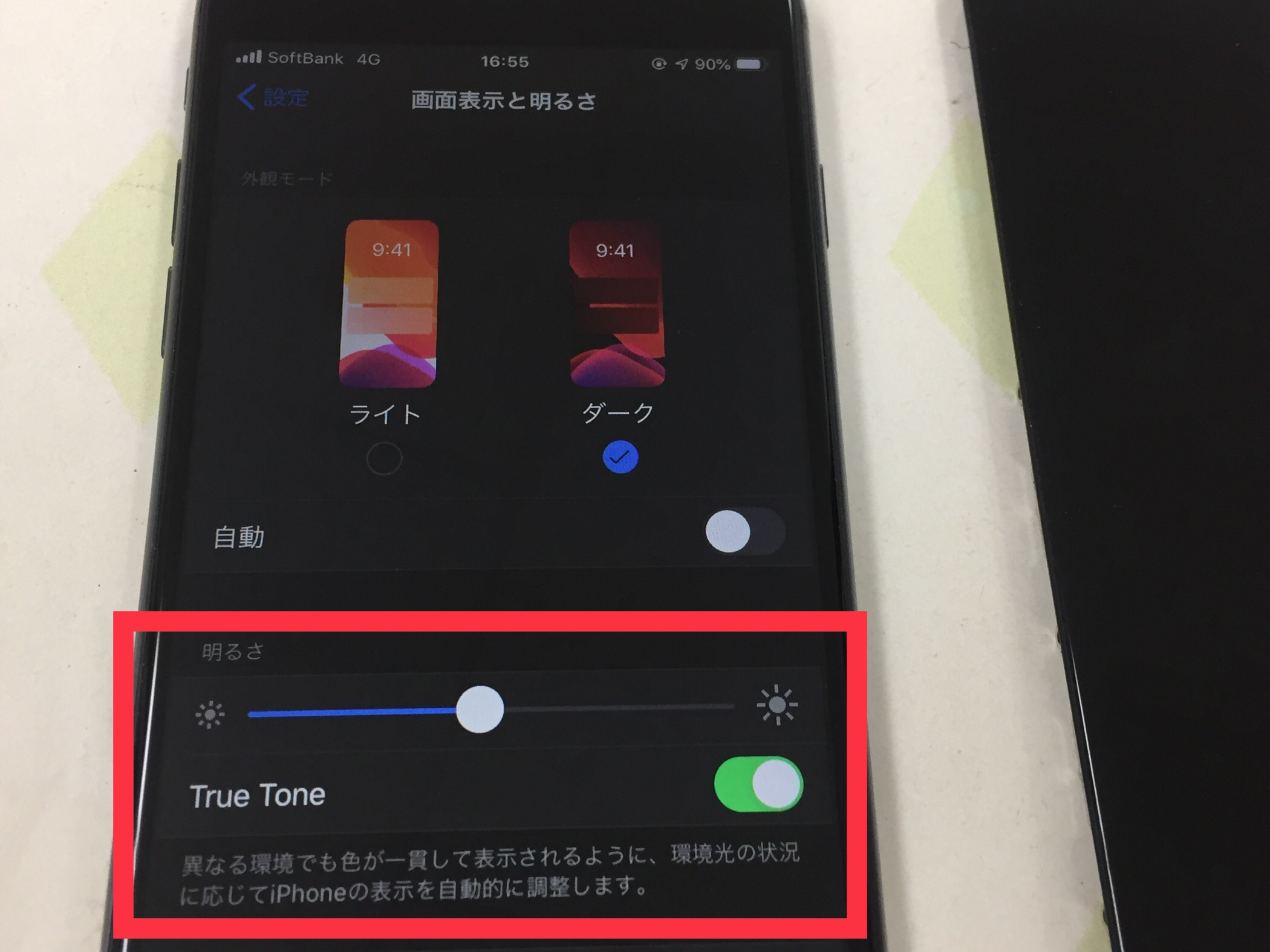 iPhone8以降の機種で画面修理を互換パーツで行うと設定→画面表示と明るさ→True Toneという機能が消えてしまい使用出来なくなりますがこちらのパーツは修理後も問題なくTrue Tone機能をご利用頂けます。