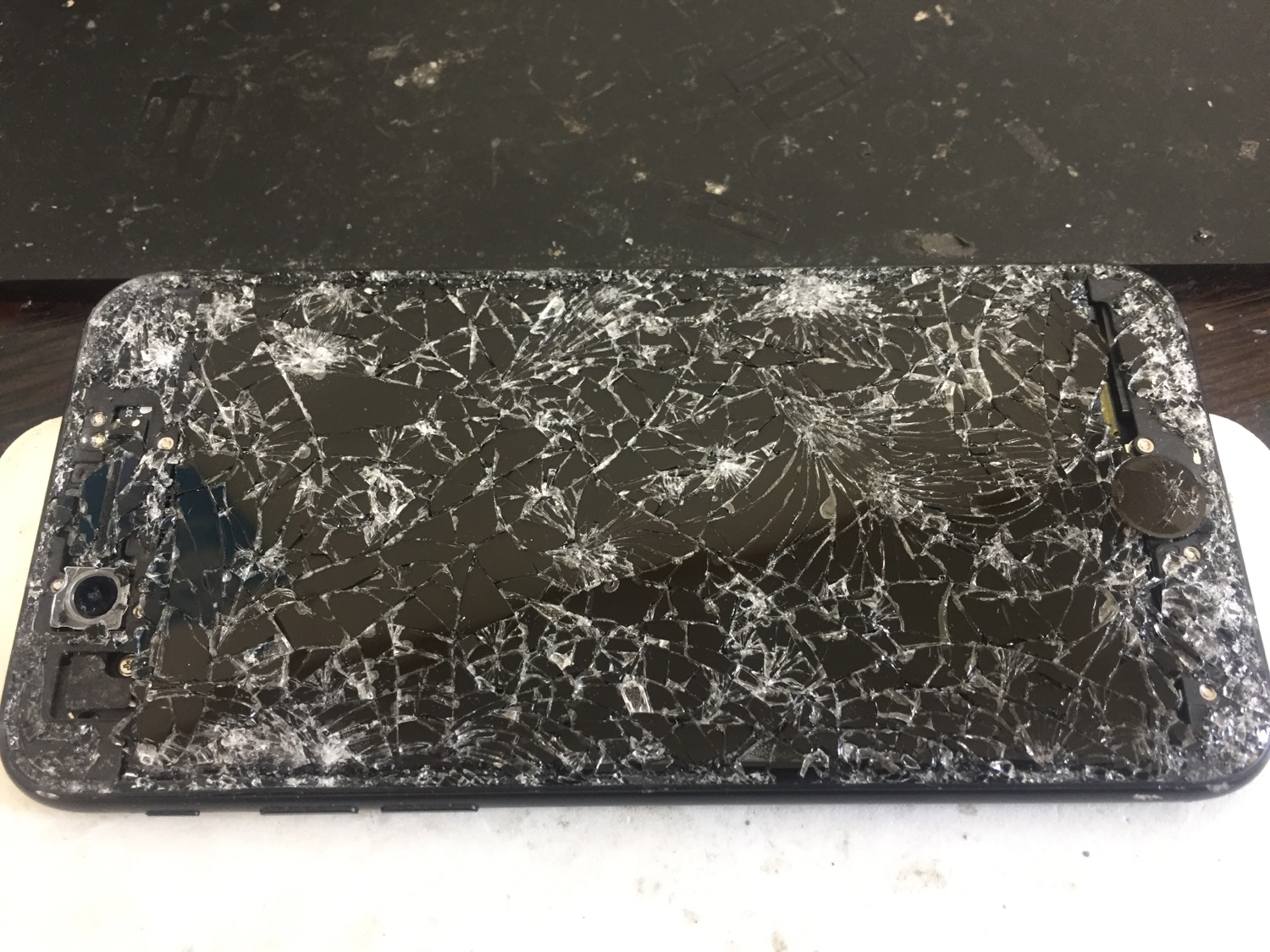 一度テスト用の画面に付け替えてみると何とか起動したもののホームボタンも割れており反応しない、カメラも破損、しばらくすると勝手に再起動するなど不安定な状態でした。