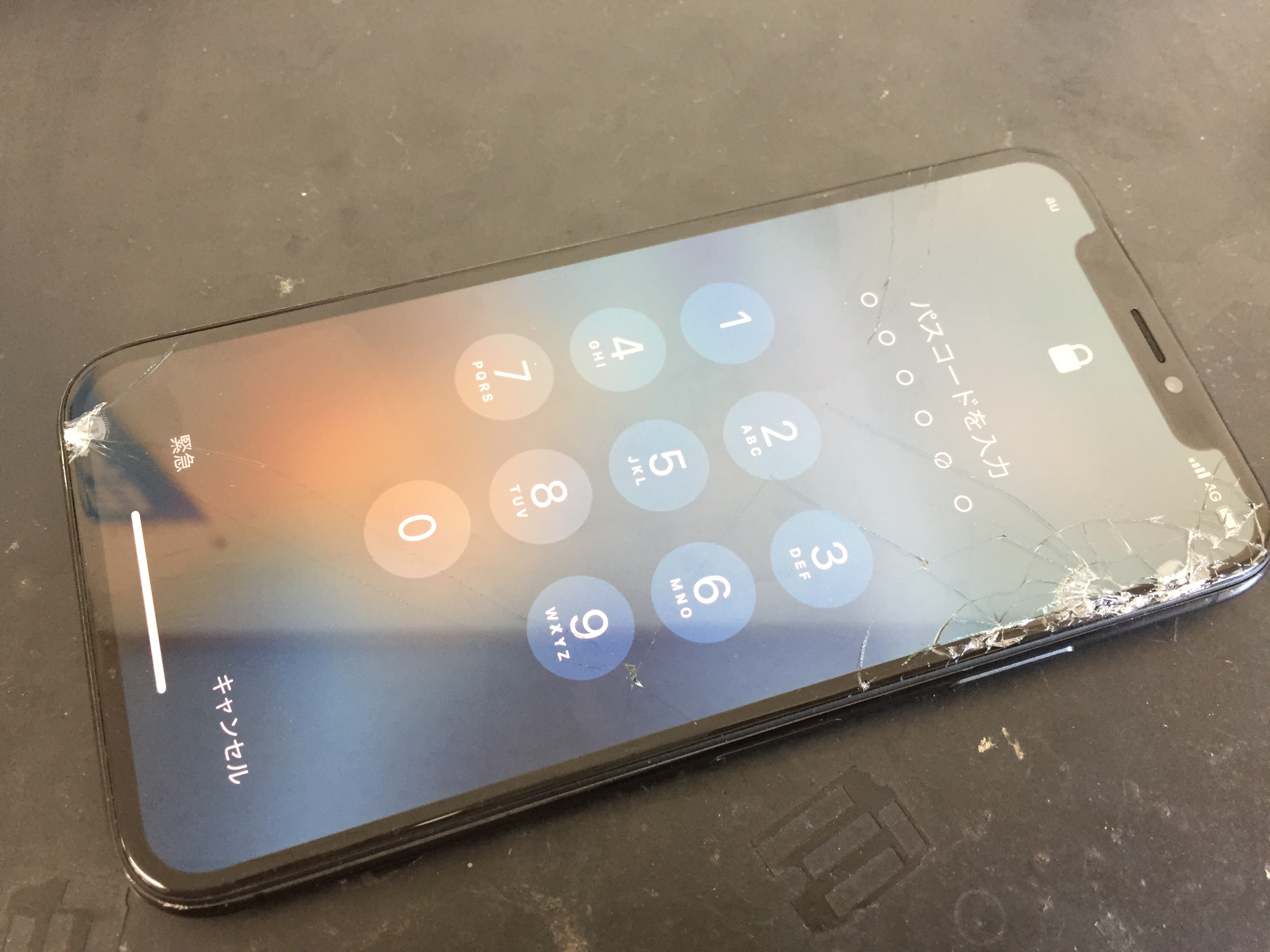 その影響で画面上半分のタッチパネルが反応せず画面のパスコードが開けない状態でした。