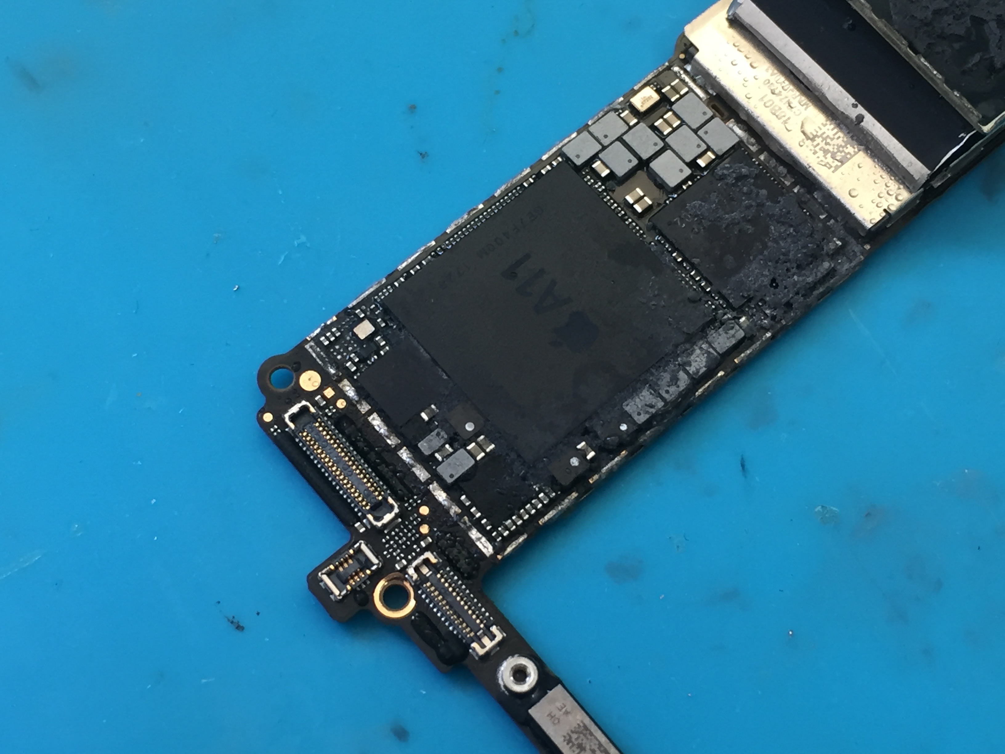 強制再起動なども一切反応がございませんでしたので受付時に上記説明をさせて頂き分解、基板をチェックすると通電させていない状態であれば特に目立つショートは見られませんでしたが通電させるとショートしているのが確認出来ました。
