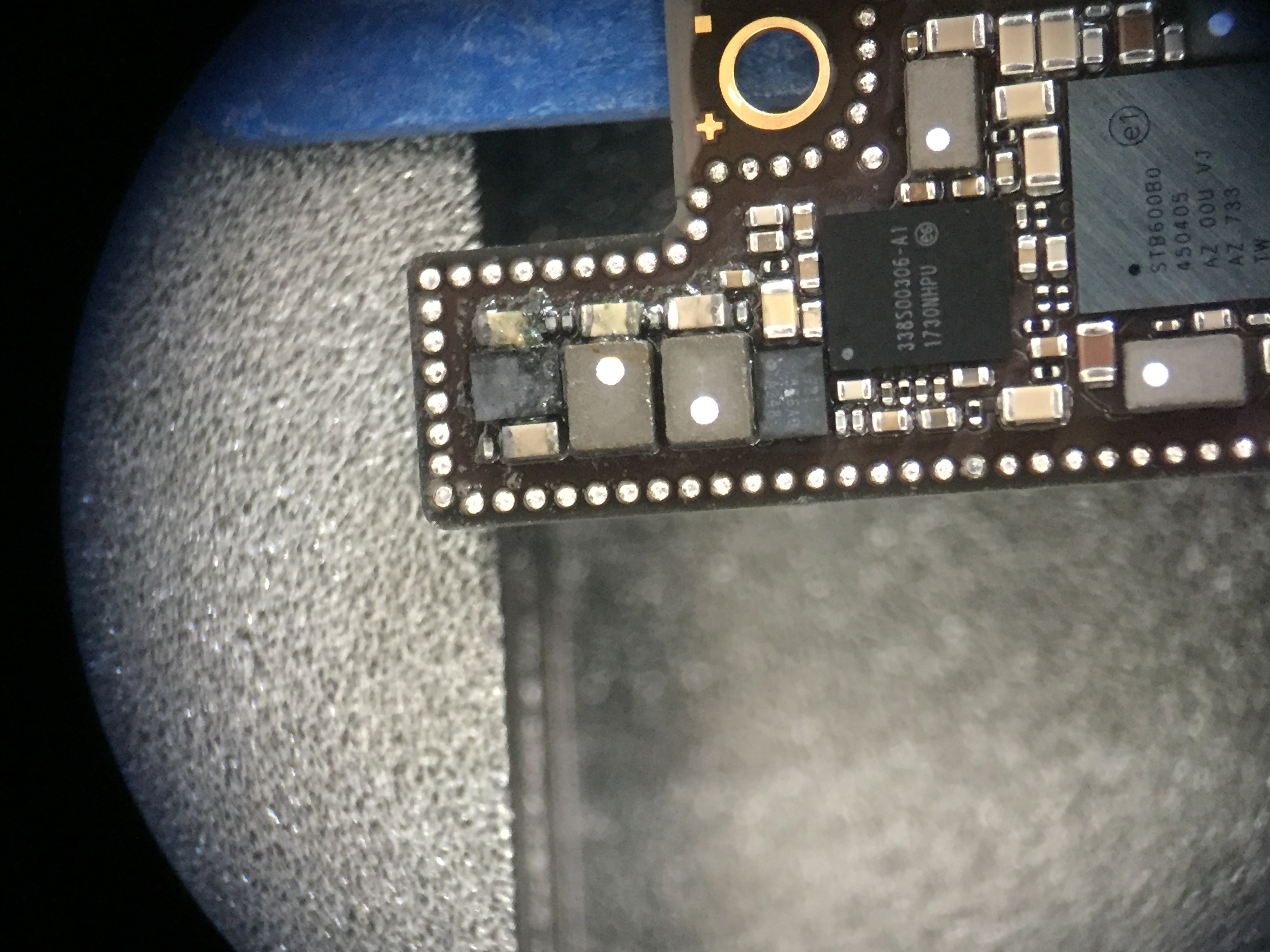 分離が終わるとメイン基板には小さなチップ類やICチップが数百個実装されておりますのでその中からショートしている箇所を探していきます。
