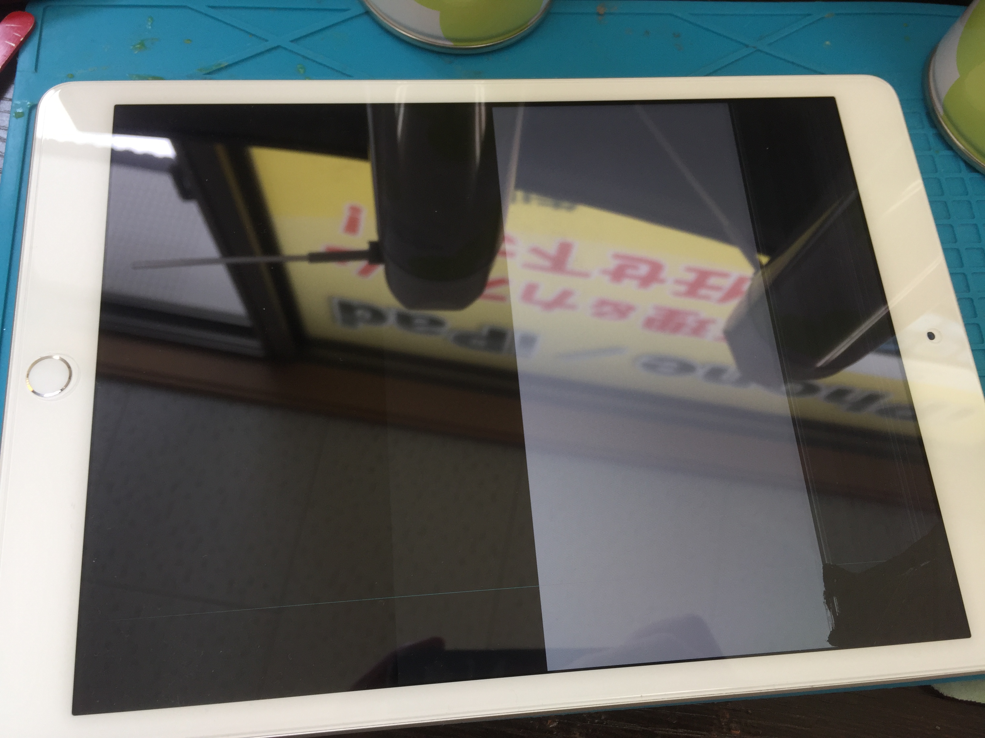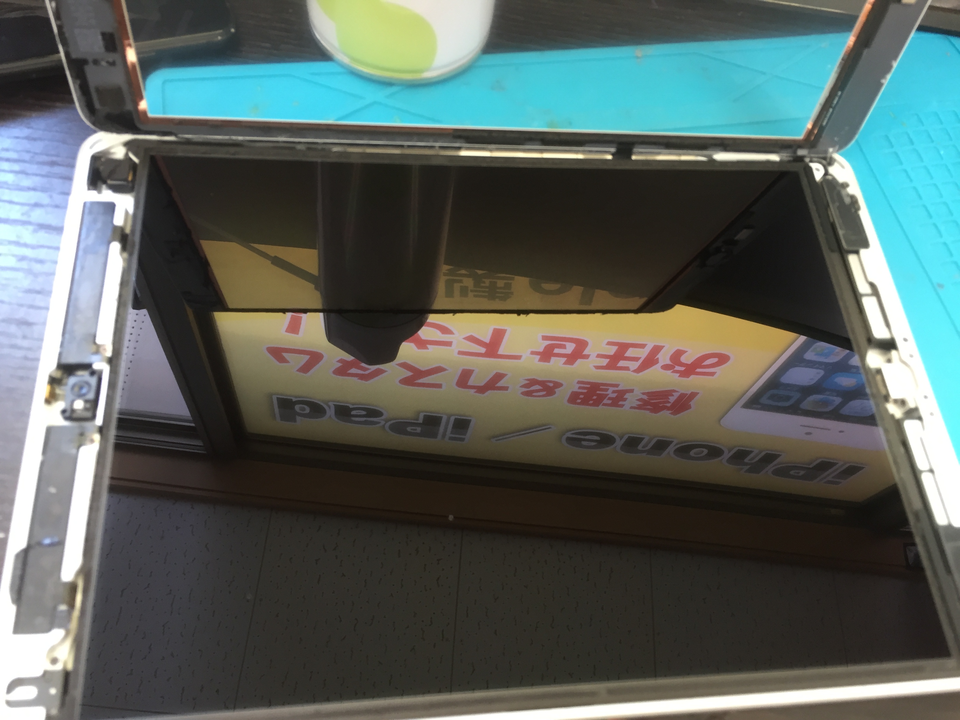 完了後、メイン基板の故障で起動しなくなった端末を分解しガラス、液晶パネルそれぞれ取り外します。