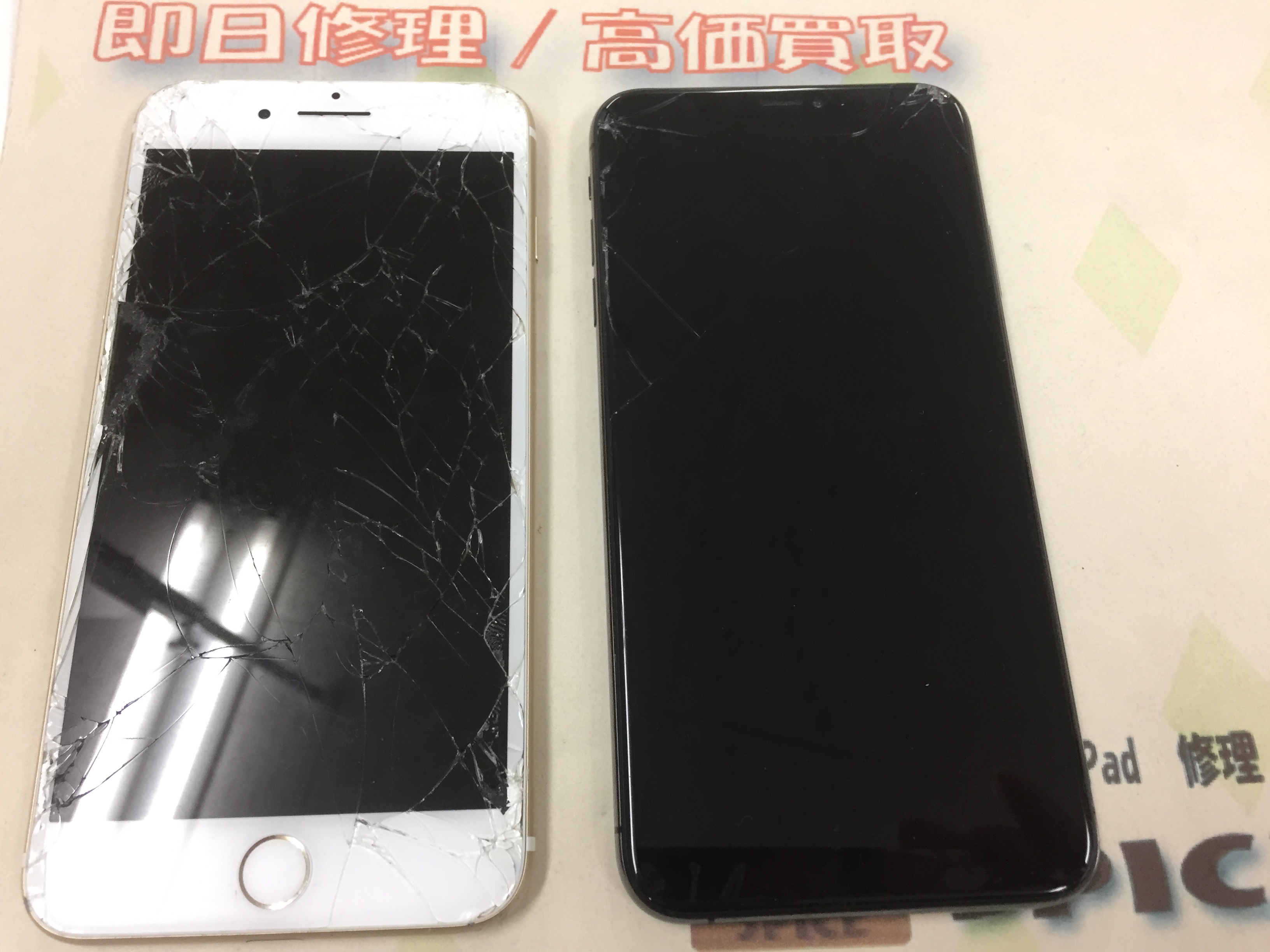 7Plusは画面が割れており、XS MAXも割れがあり更に水没により起動しなくなった端末でした
