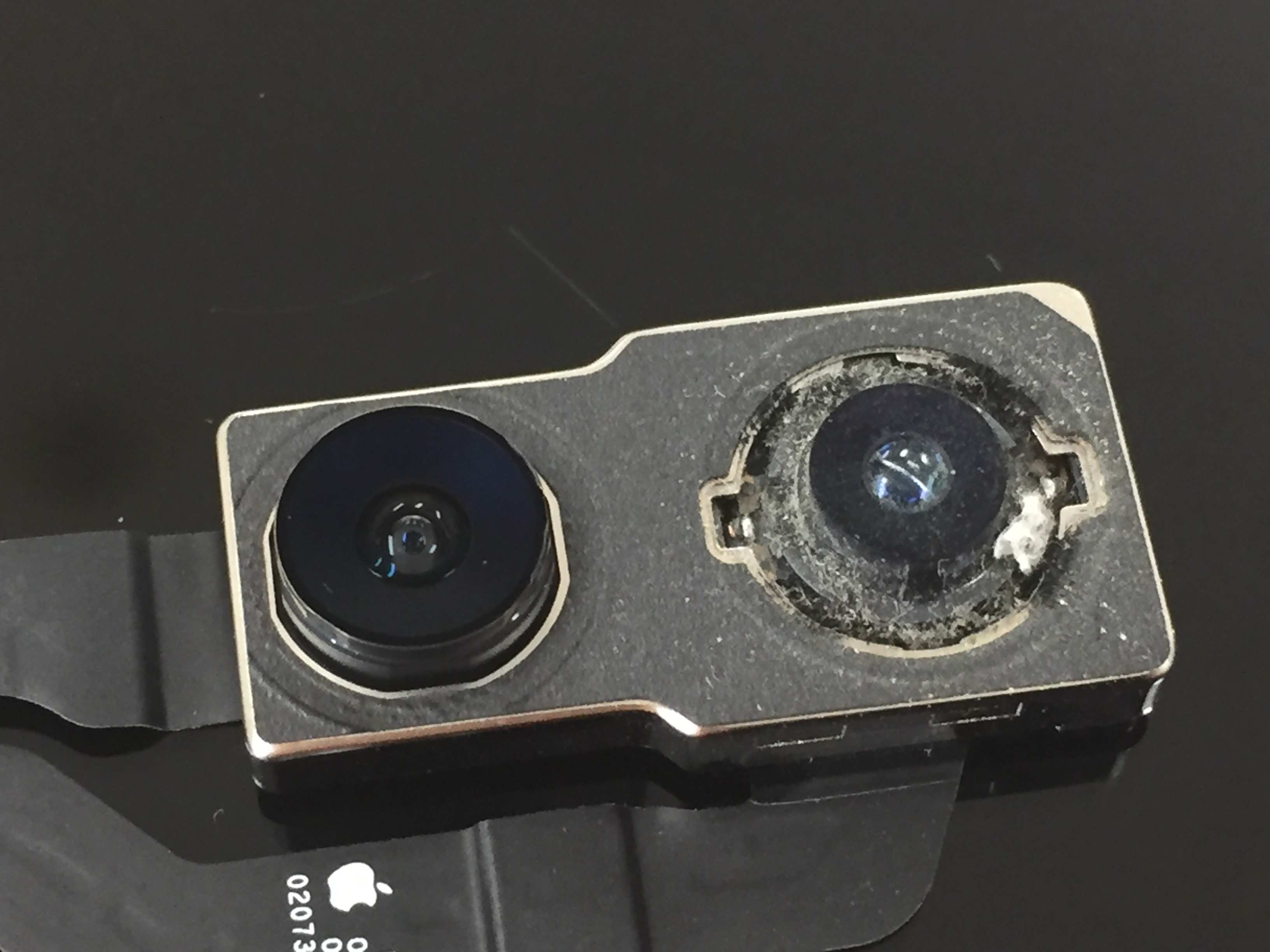 レンズが割れ一部剥がれ内部が露出している状態でカメラパーツ側のレンズにも汚れが固着、カメラを起動すると全体的に黒い汚れが写りこみ綺麗な写真が撮れない状態でした。
