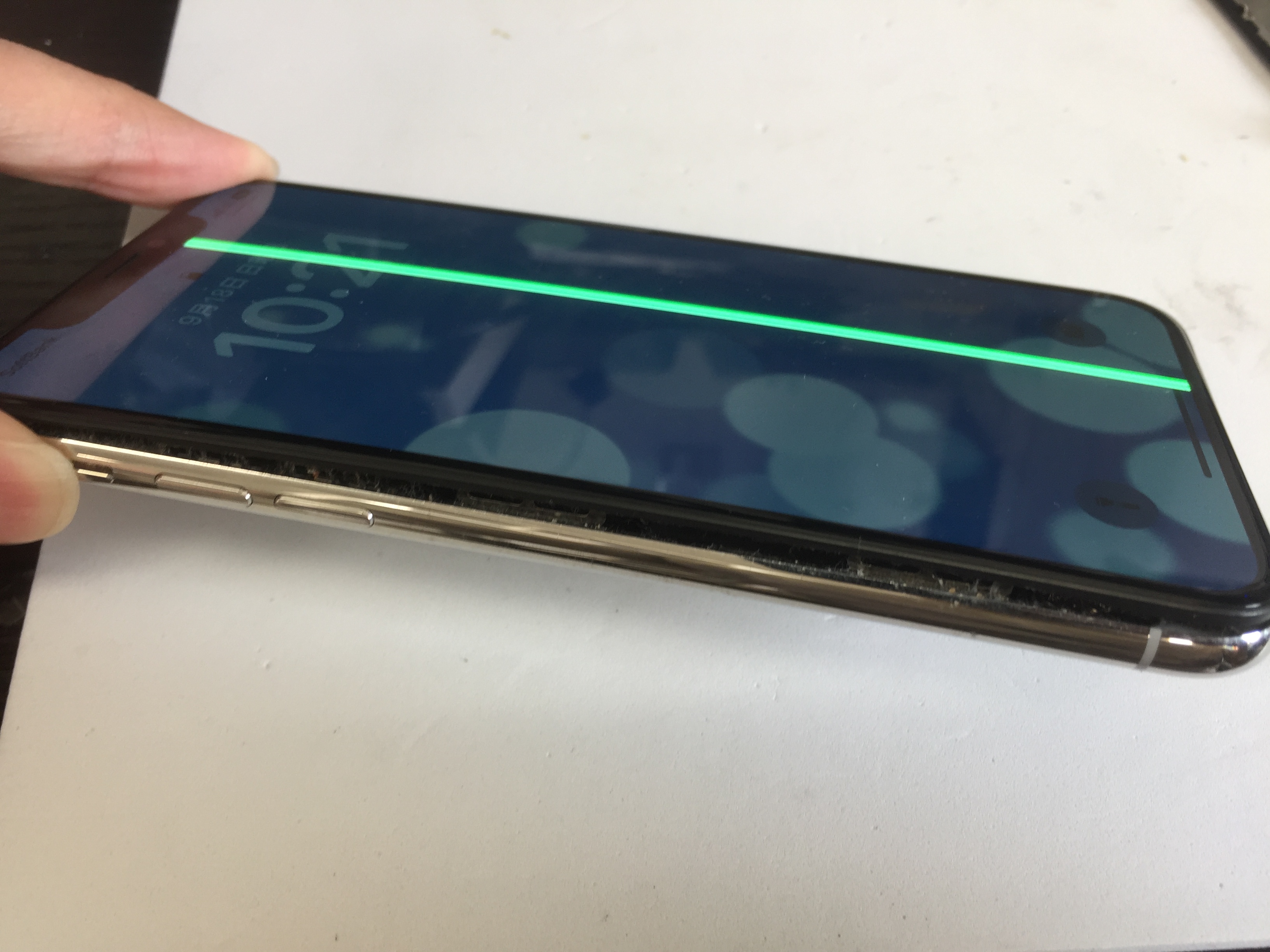 画面に緑の縦線が出ているとの事でご来店ですが受付時に確認すると劣化によりバッテリーが膨張し画面が大きく浮き上がっている状態でした。