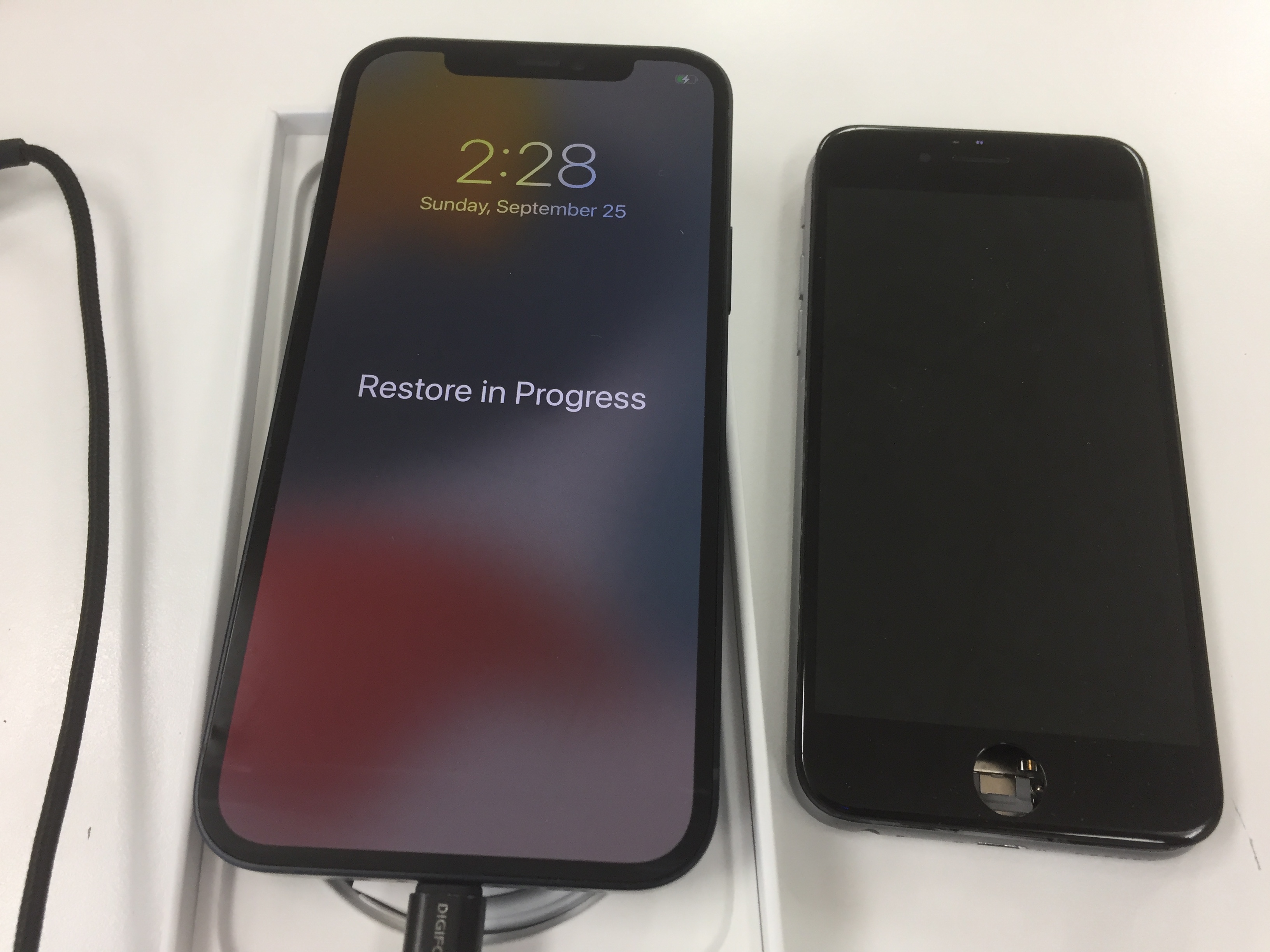 端末は当店で販売していたiPhone12をご購入下さいましたのでそちらへ取り出したデータを復元し作業完了です。