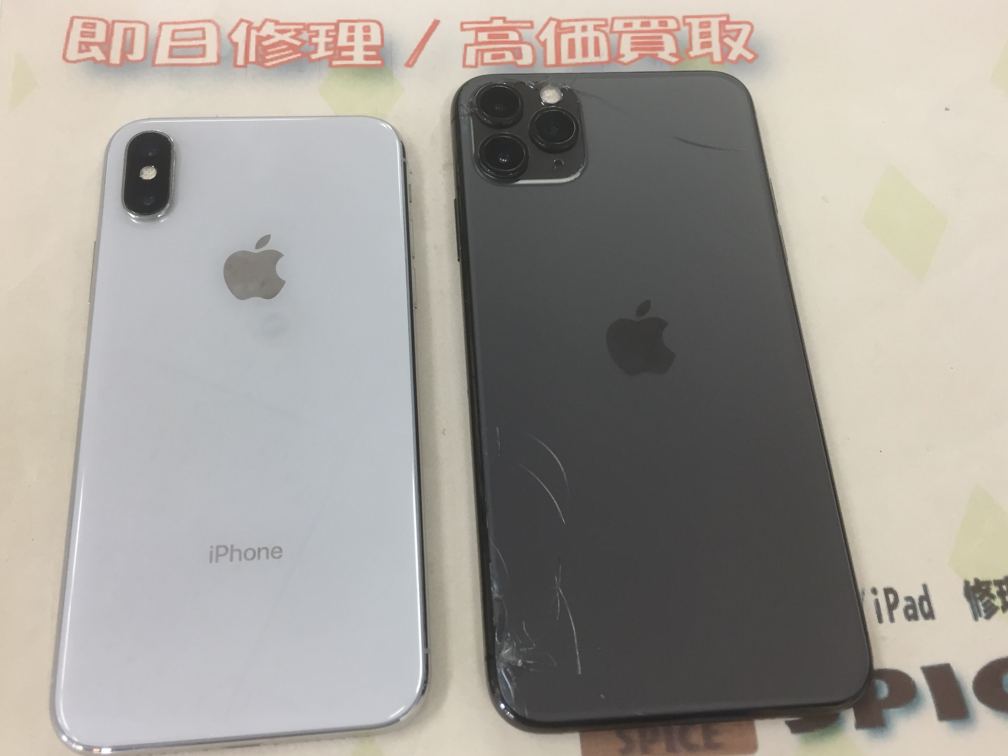 iPhone XはFaceIDが故障し顔認証が使用出来ない、11Pro Maxは背面が割れておりバッテリーも劣化している状態でした。