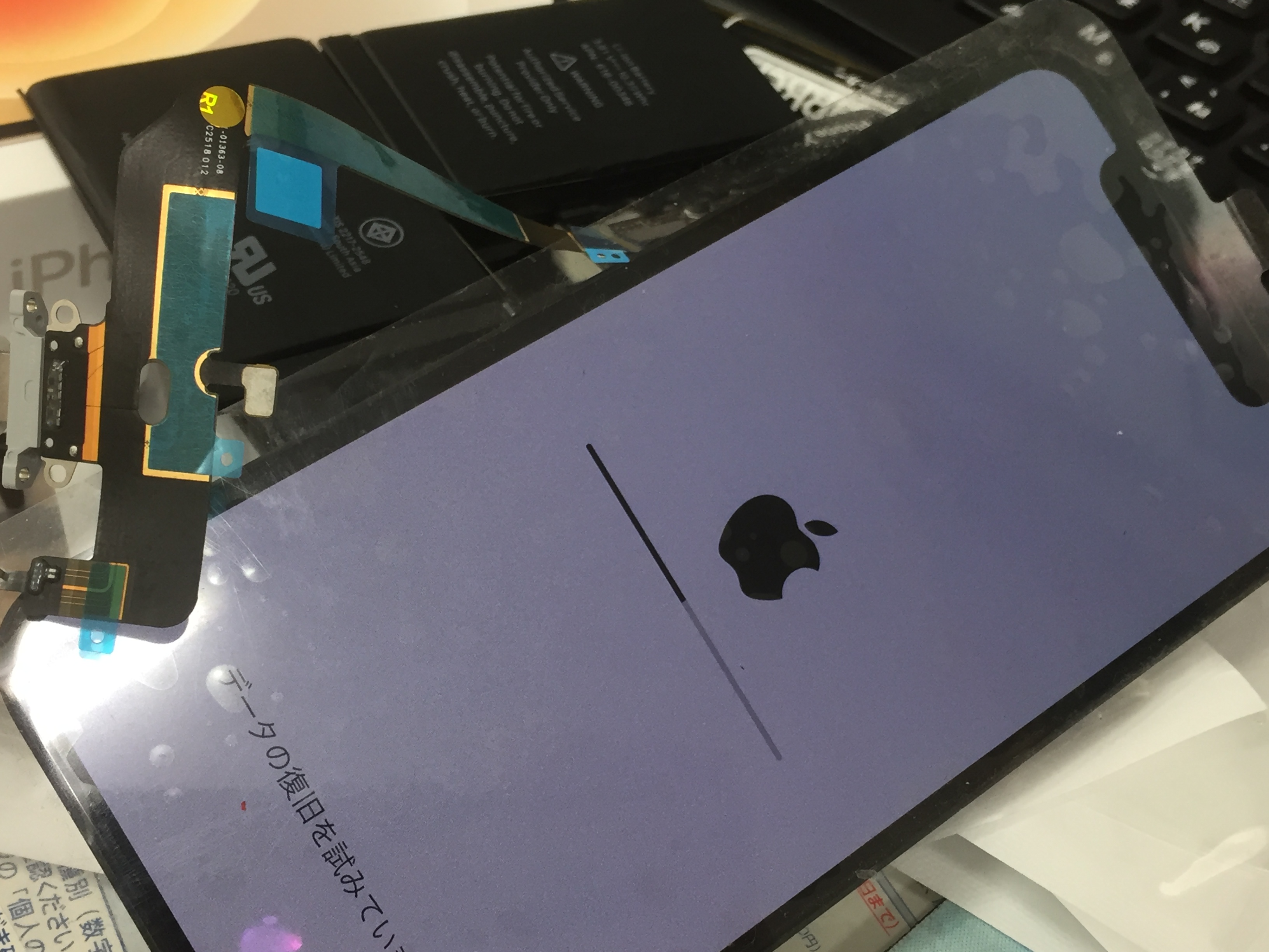 更にテスト画面を取り付けると表示はされるようになったものの起動させるとパスコードを2回入力を求められその後、画面にデータの回復を試みていますとの表示が。