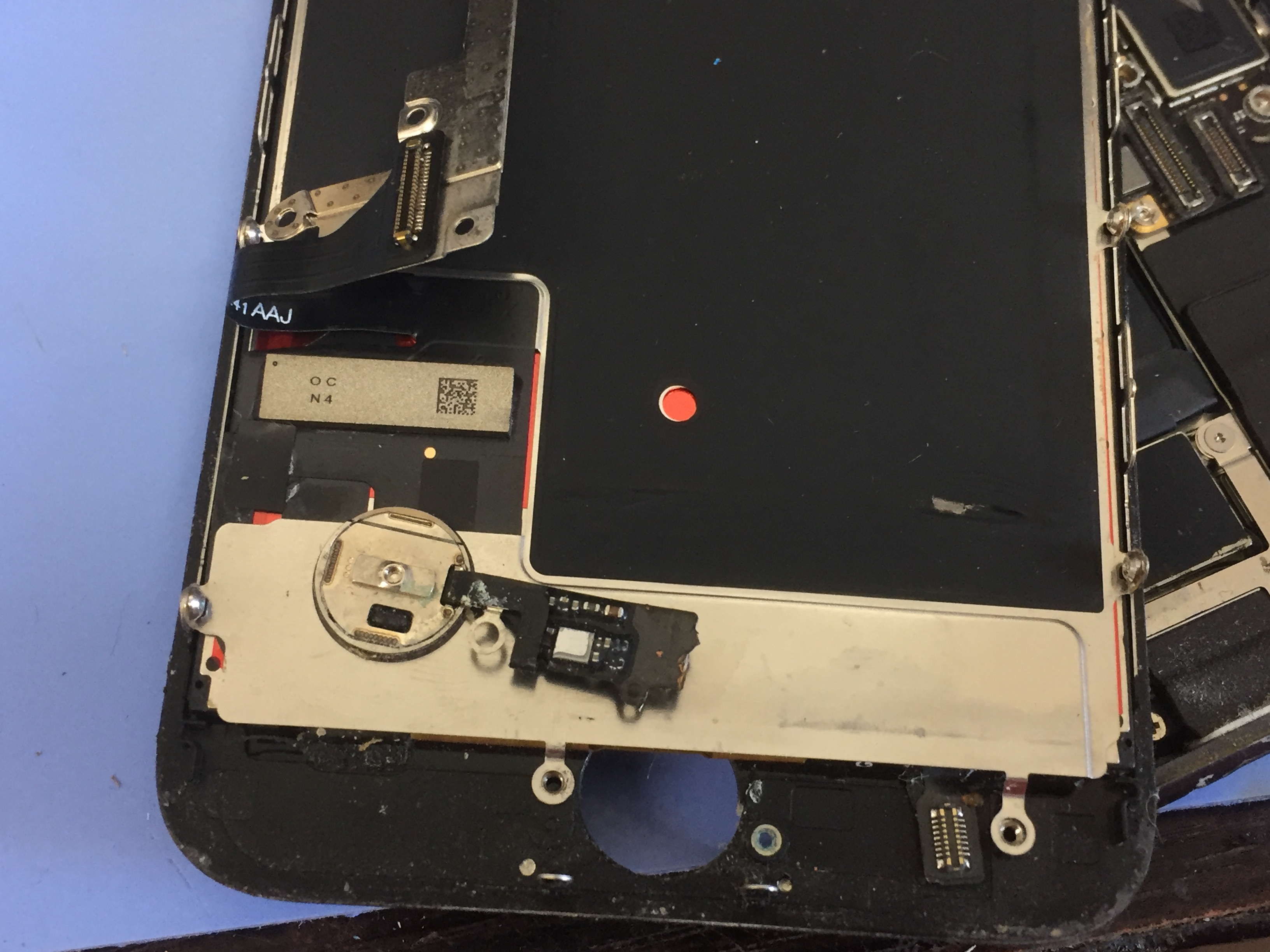 2台のご依頼で1台は以前お客様ご自身で画面修理されておりその時にホームボタンを破損させ反応しない状態、もう1台は使用中に液晶の左下が異常に熱くなりシミのようなものが浮き上がってくるとの事でした。