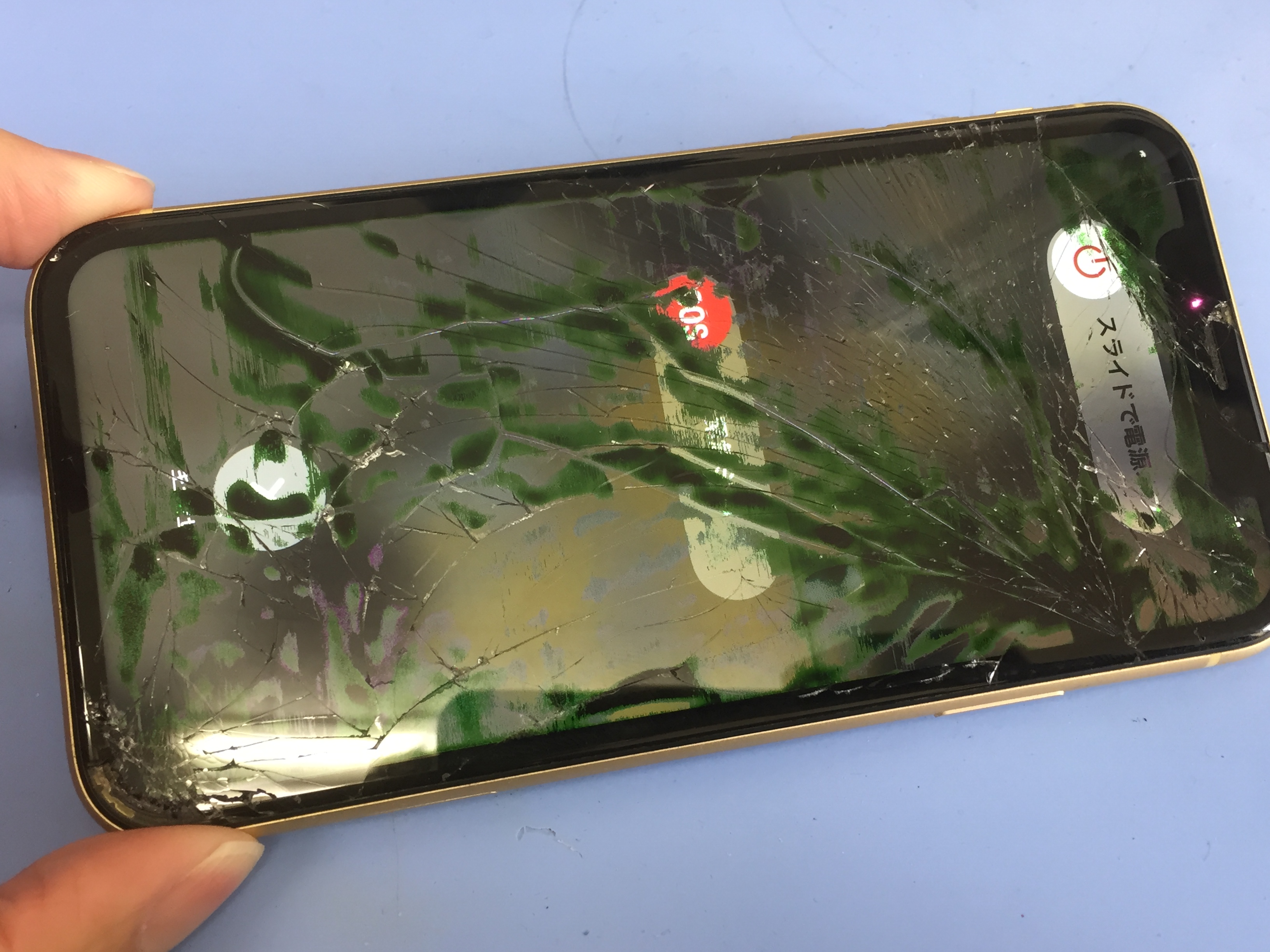 画面割れの影響で表示がおかしく画面上部のタッチパネルも反応しない状態でした。