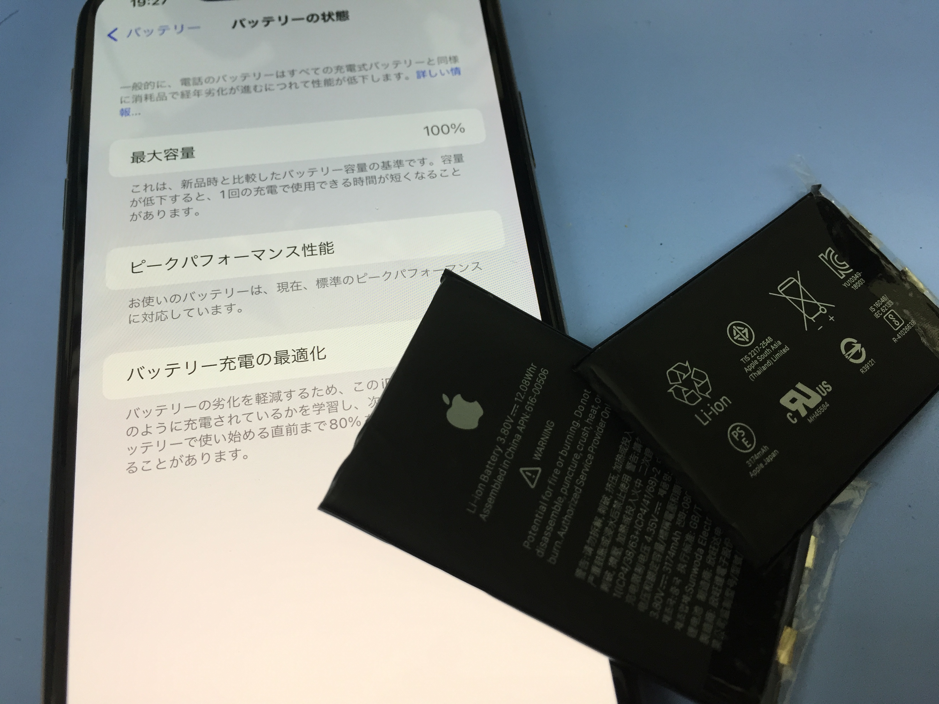 iPhone XS以降の機種は全てApple以外でバッテリーの交換を行うと設定のバッテリー項目で本来確認出来る劣化具合の最大容量が表示されず、不明な部品と表示される仕様となっております。