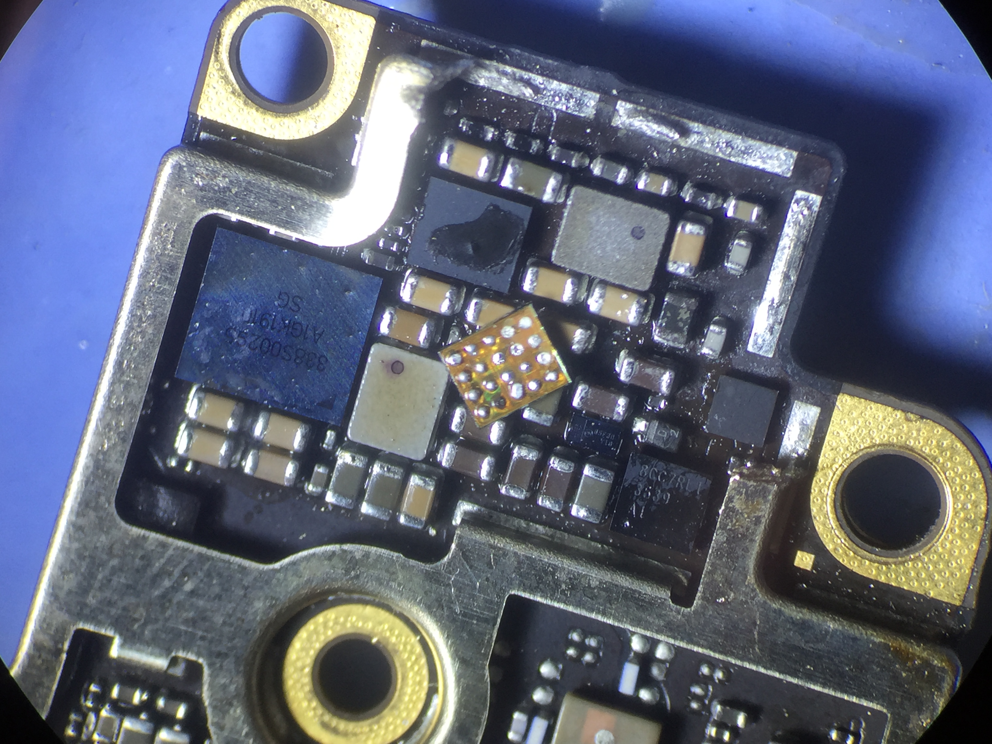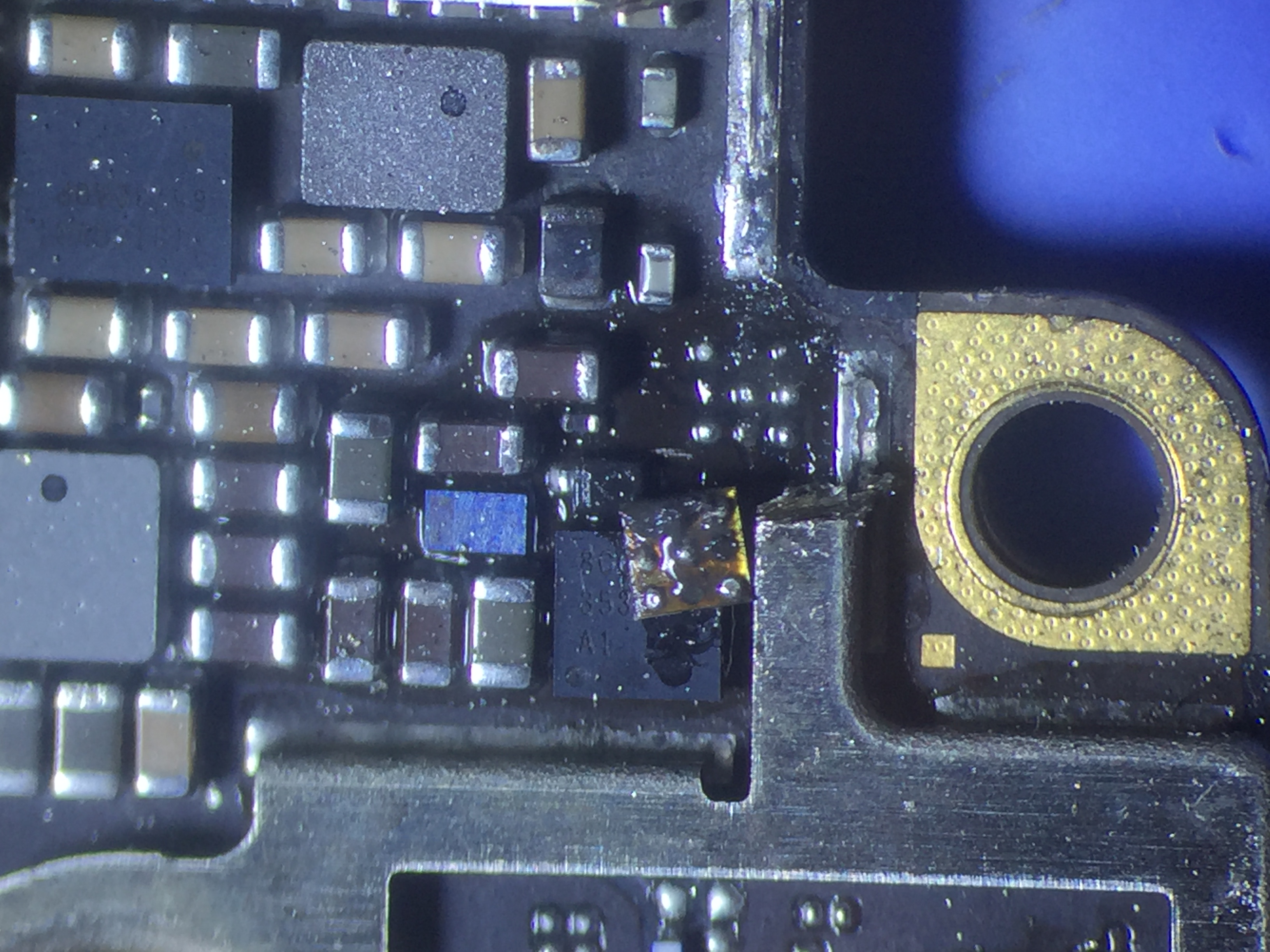まずは若干漏電がございますのでショートしている回路の特定を行いこちらの小さなICが損傷しておりました。