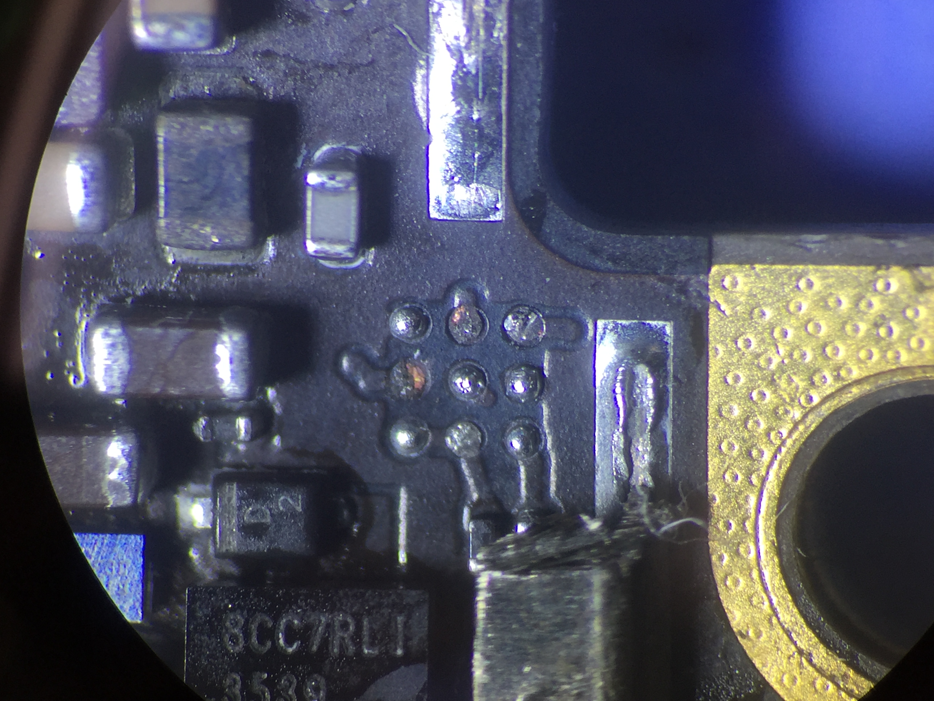 特に基板上の液晶関連の回路が集中している部分に黒く焦げた跡などが多数見られました。