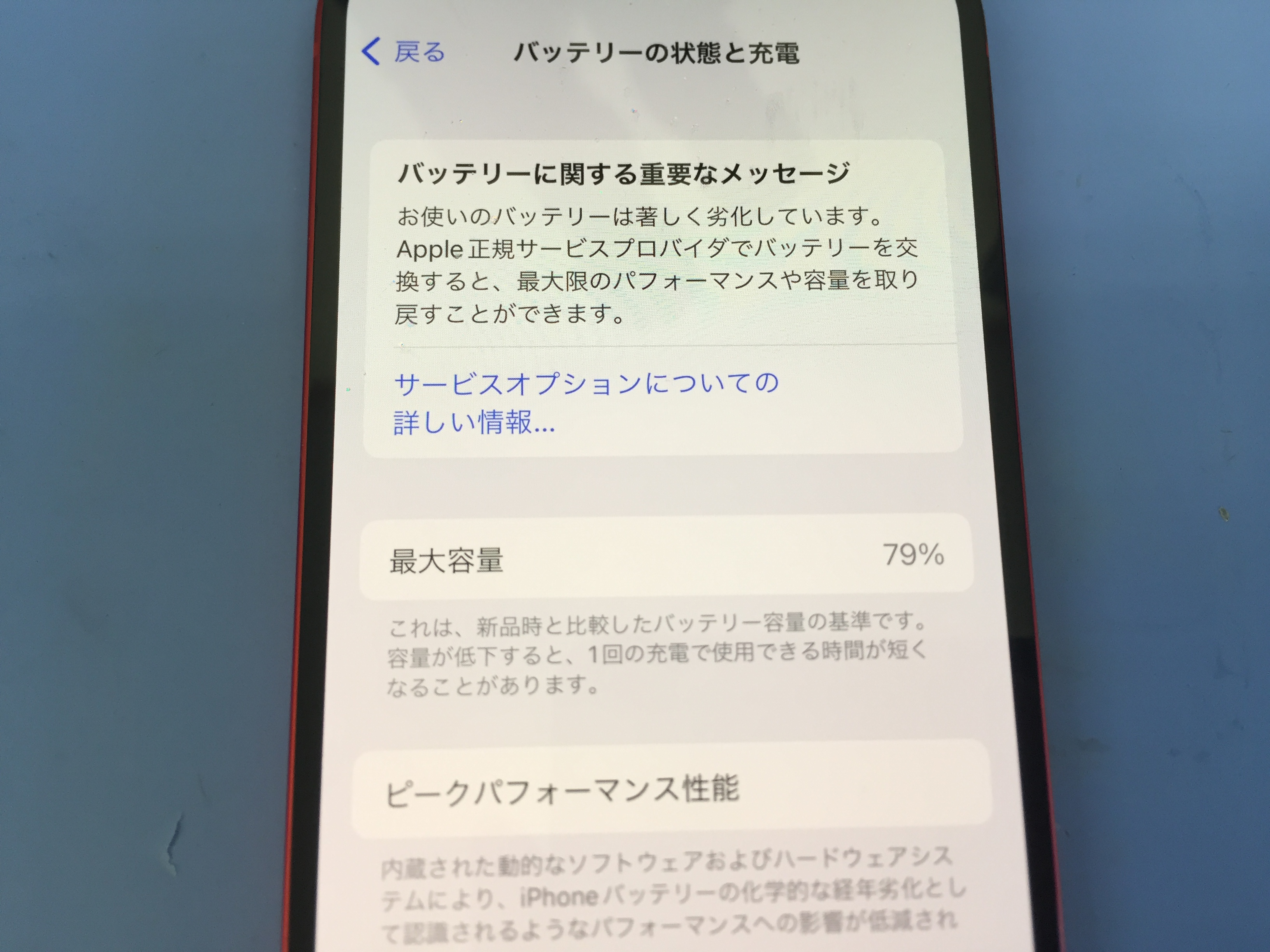 今回の端末がバッテリーの最大容量が低下し設定内に劣化のメッセージが表示されておりました。