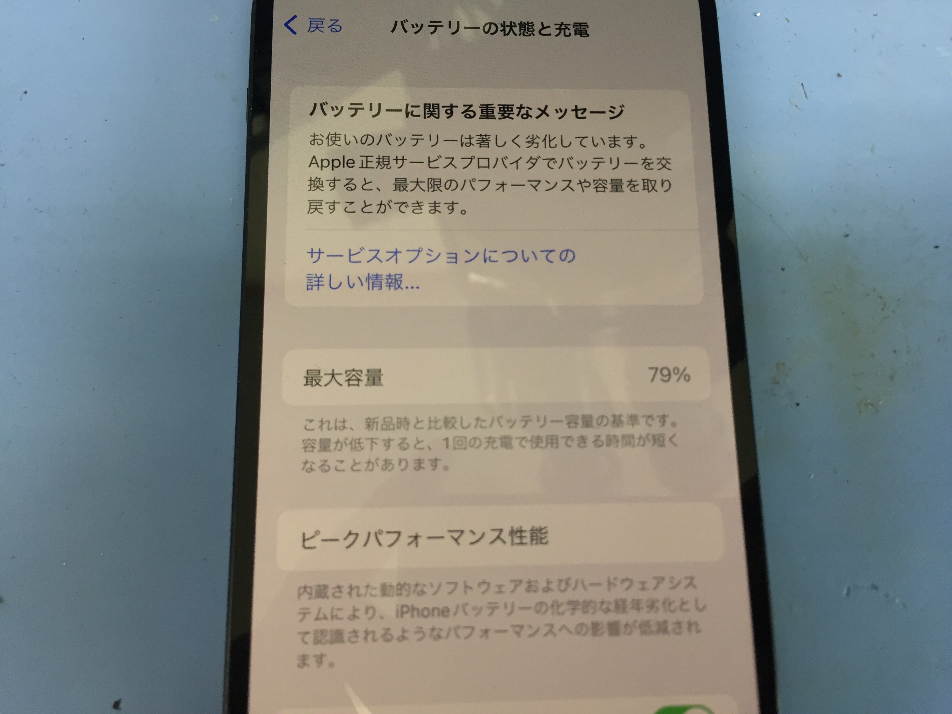 XS以降の機種は通常、メーカー以外でバッテリーの交換を行うと最大容量が非表示となり非正規のメッセージが表示されるようになります。